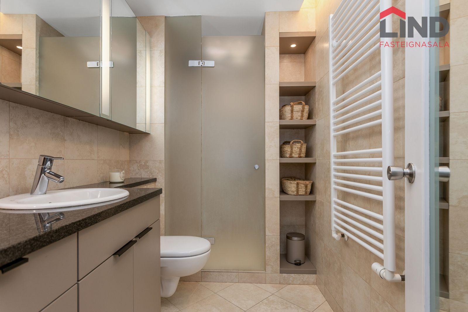 Baðherbergi: Flísalagt í hólf og gólf búið sérsmíðaðri innréttingu með handlaug, skápum, speglaskáp, upphengdu salerni, handklæðaofni og flísalagðri ''walk in" sturtuaðstöðu. Loft er niðurtekið að hluta, búið innbyggðri lýsingu. Granít á borði og í hillum í sturtu.