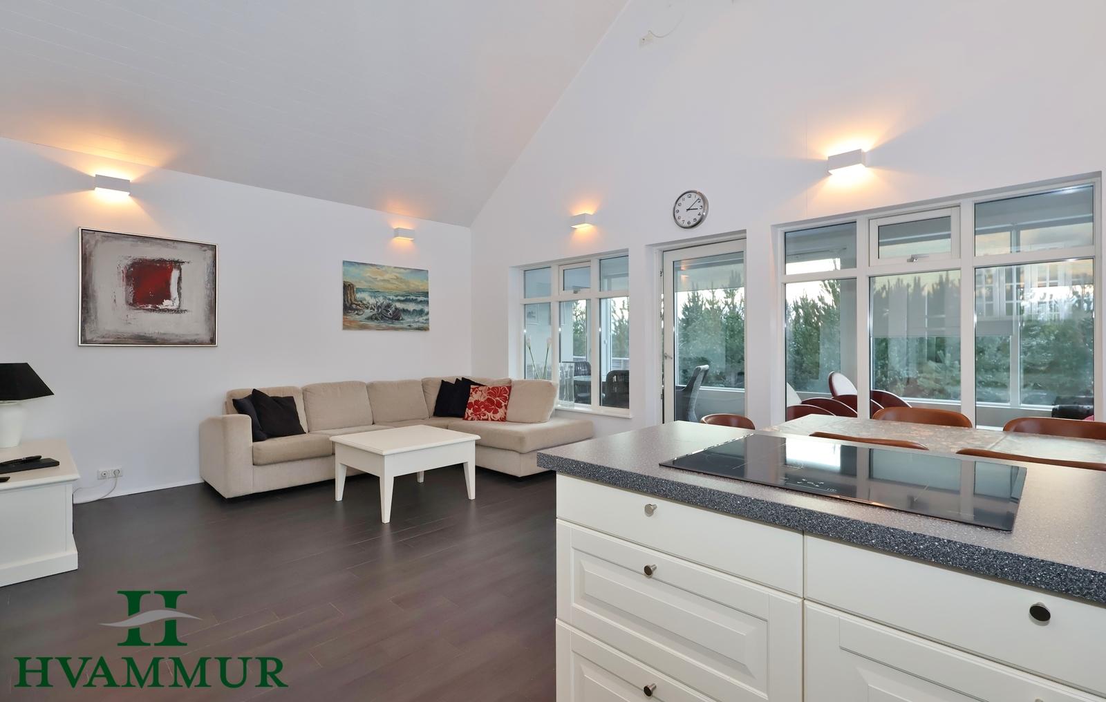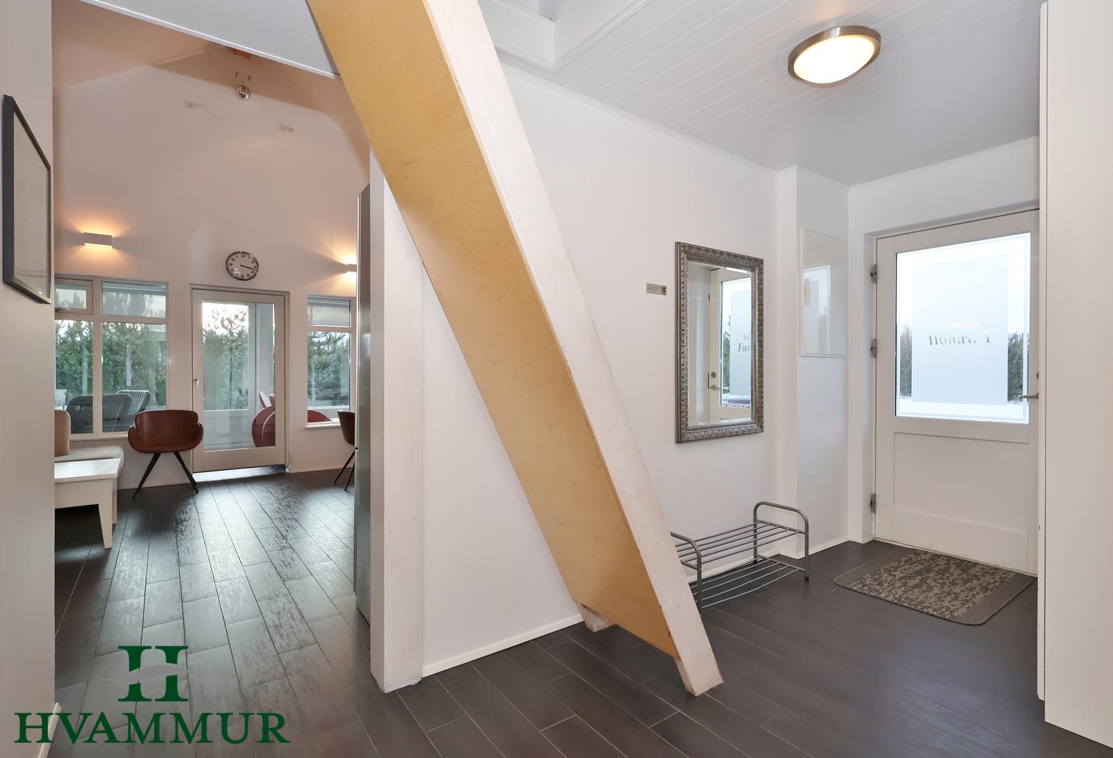 Forstofa er með flísum á gólfi og hvítum skáp. Timbur stigi er úr forstofunni og upp á svefnloftið. Eldhús og stofa eru í opnu rými þar sem flísar eru á gólfum og loft tekin upp. Í eldhúsi er hvít sprautulökkuð innrétting með góðu skápa- og bekkjarplássi. Úr stofunni er hurð inn í sólstofu sem er með flísum á gólfi, gluggum til þriggja átta og tveimur hurðum út á verönd. Svefnherbergin tvö, bæði með flísum á gólfi og hvítum fataskápum. Baðherbergi er flísalagt bæði gólf og veggir, ljós innrétting, upphengt wc, sturta með glerhurðum og opnanlegur gluggi. Tengi eru fyrir þvottavél inn á baðherberginu. Svefnloft er yfir um helming hússins og þar er harð parket á gólfum.