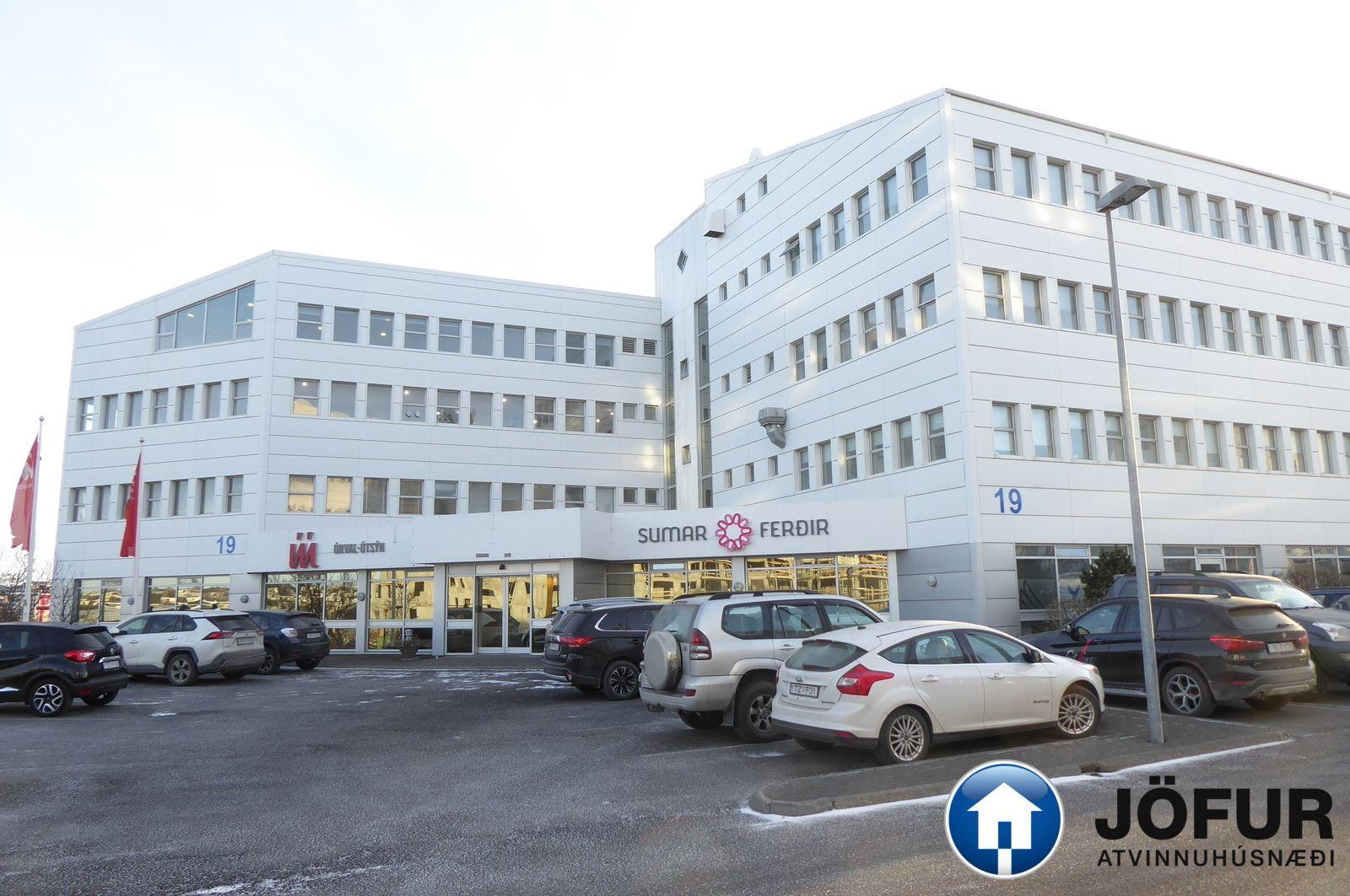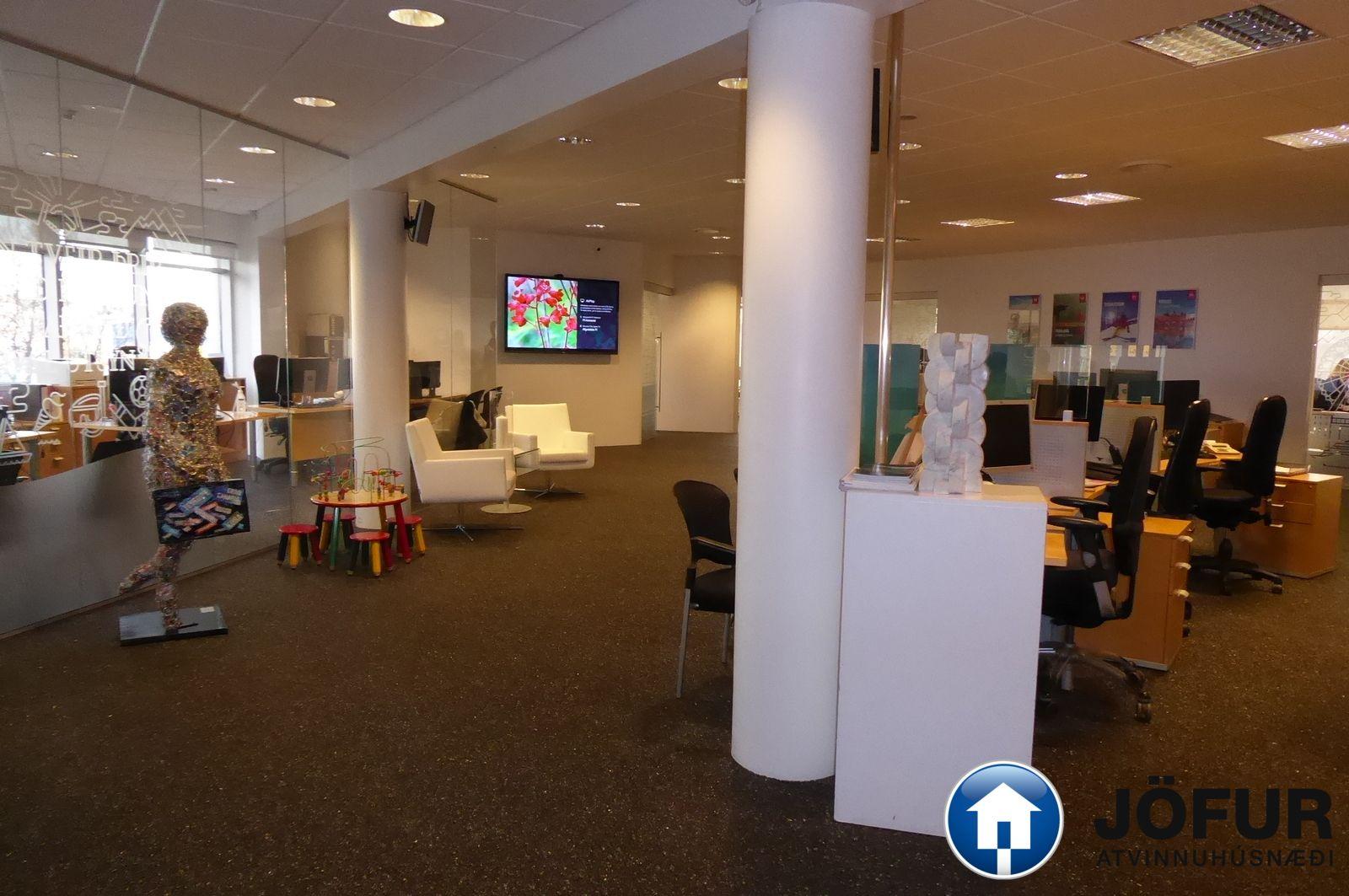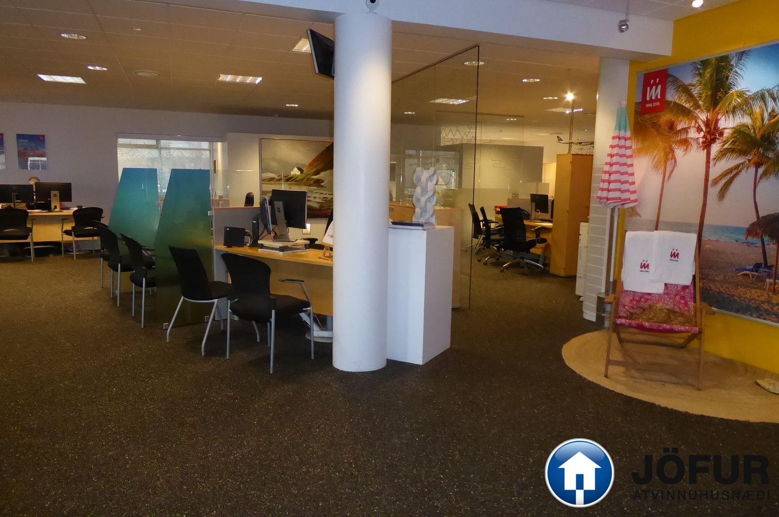 Jarðhæðin er 473,0 m² og skiptist upp í opið vinnurými, 5 lokaðar skrifstofur, eitt fundarherbergi, tvær skjalageymslur og snyrtingu. Steinteppi er á gólfi og kerfisloft með innfelldri lýsingu í lofti. Loftræsikerfi er á hæðinni. Inngangur er beint inn af bílastæðum og úr sameign hússins. Kjallari er 277,7 m² en þar er til staðar fullbúið eldhús/ mötuneyti með rúmgóðum matsal f. 30-40 manns, þrjár snyrtingar og búningsklefi. Dúkur er á gólfi í eldhúsi. Í kjallara er einnig til staðar geymslurými og sérrými fyrir loftræsisamstæðu fyrir jarðhæðina. Málað gólf. Hægt er að keyra niður ramp að hurð í kjallara.