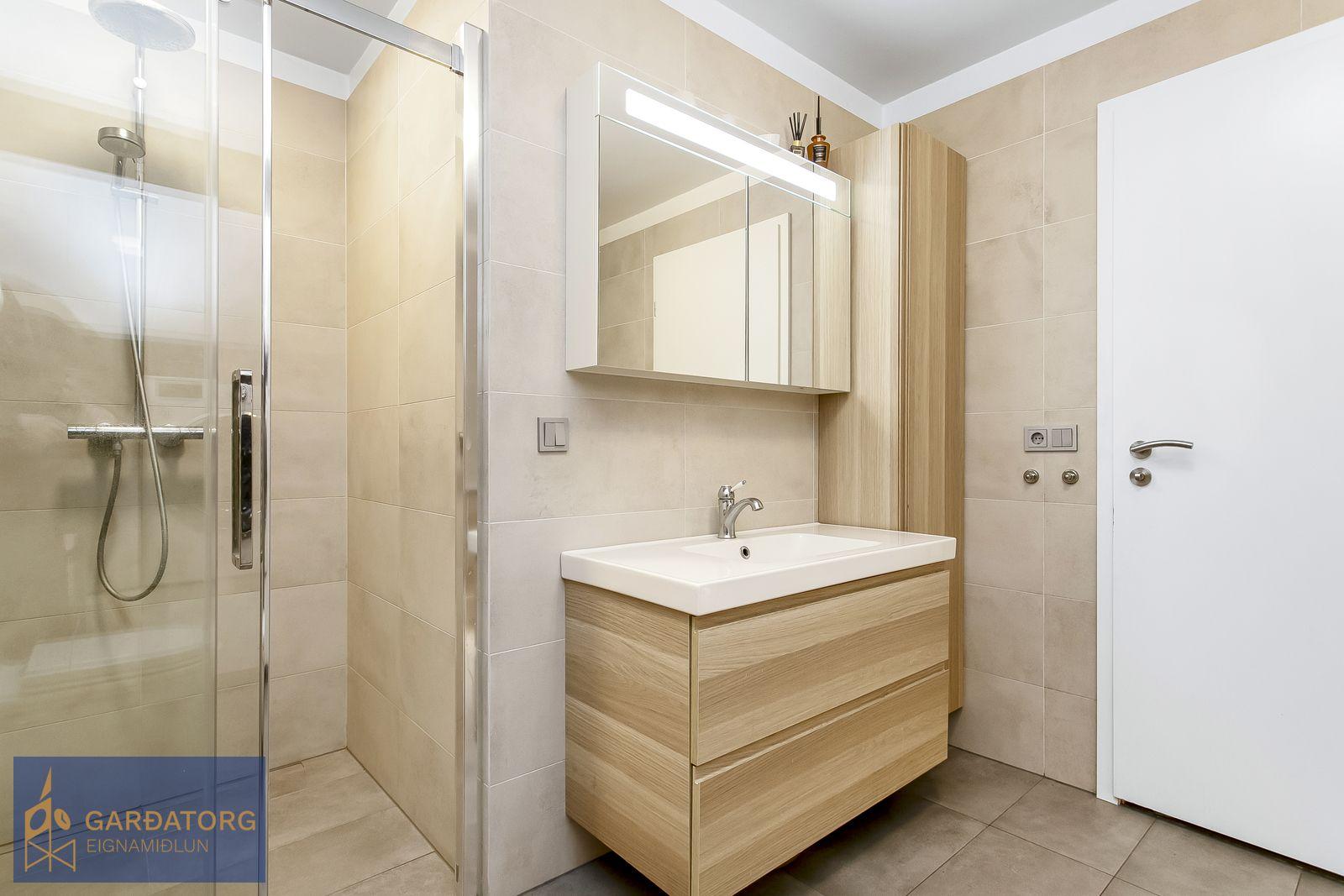 Baðherbergi: Fallegt mikið endurnýjað flísalagt baðherbergi með góðri innréttingu með rými fyrir þvottavél og þurkara, stór sturtuklefi, upphengt WC.