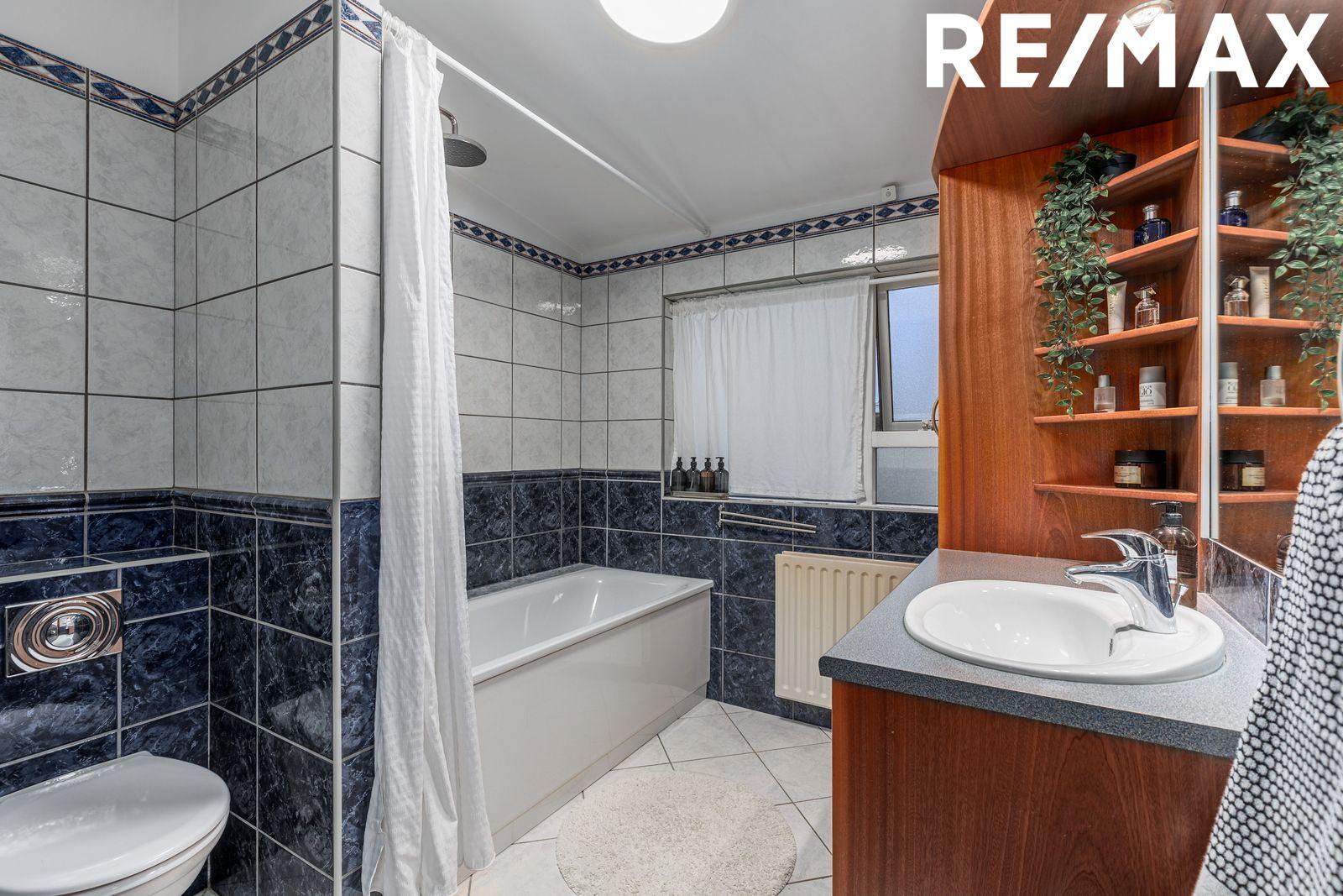 Baðherbergi: flísalagt í hólf og gólf, upphengt salerni, baðkar með sturtu og opnanlegt fag.