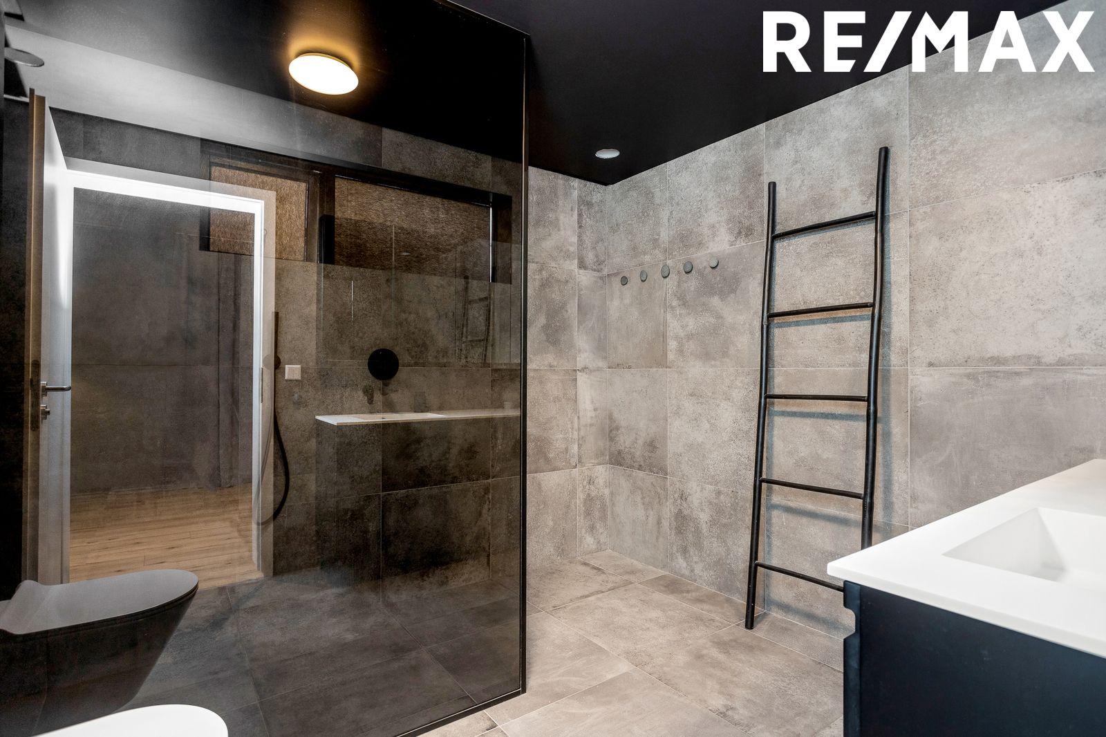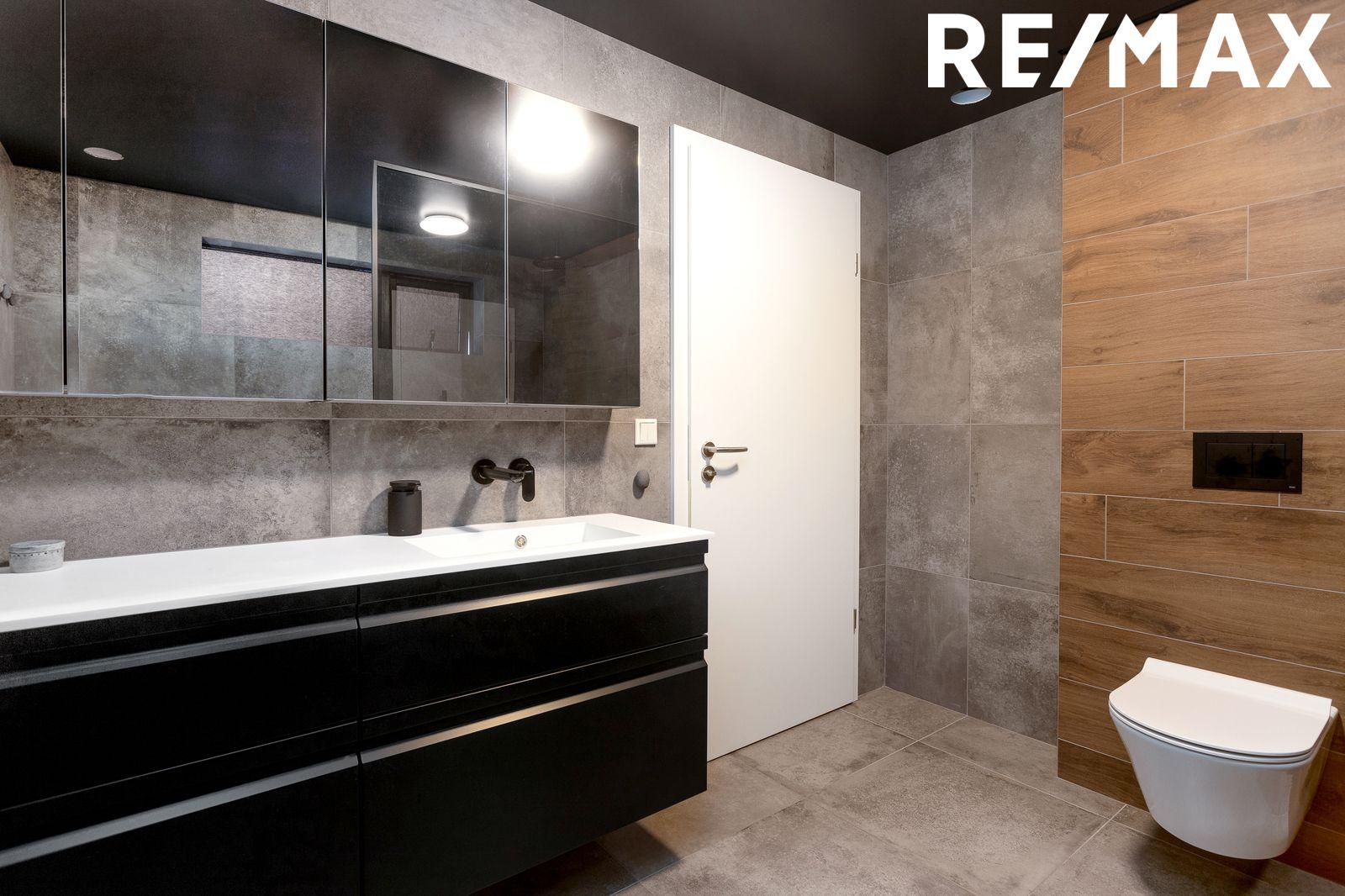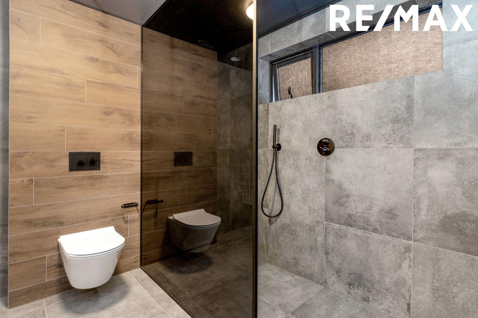 Aðalbaðherbergi: Baðherbergið er glæsilegt og nýlega endurnýjað. Fallegar dökk gráar 60 x 60 cm flísar eru á gólfi og á veggjum fyrir utan vegg við salerni sem er flísalagður með flísum í viðar útliti. Stór sturta beint á gólf er innst í rýminu við opnanlegan glugga, skyggt gler er við sturtuna og blöndunartæki eru innbyggð. Góð innrétting er undir vaski með hvítri steinborðplötu. Fyrir ofan vaskaborðið er fjórfaldur speglaskápur á vegg. Snagar fyrir handklæði eru á vegg á móti sturtunni og búið er að leggja hitalagnir í vegginn og því nýtast snagarnir á sama hátt og handklæðaofn.