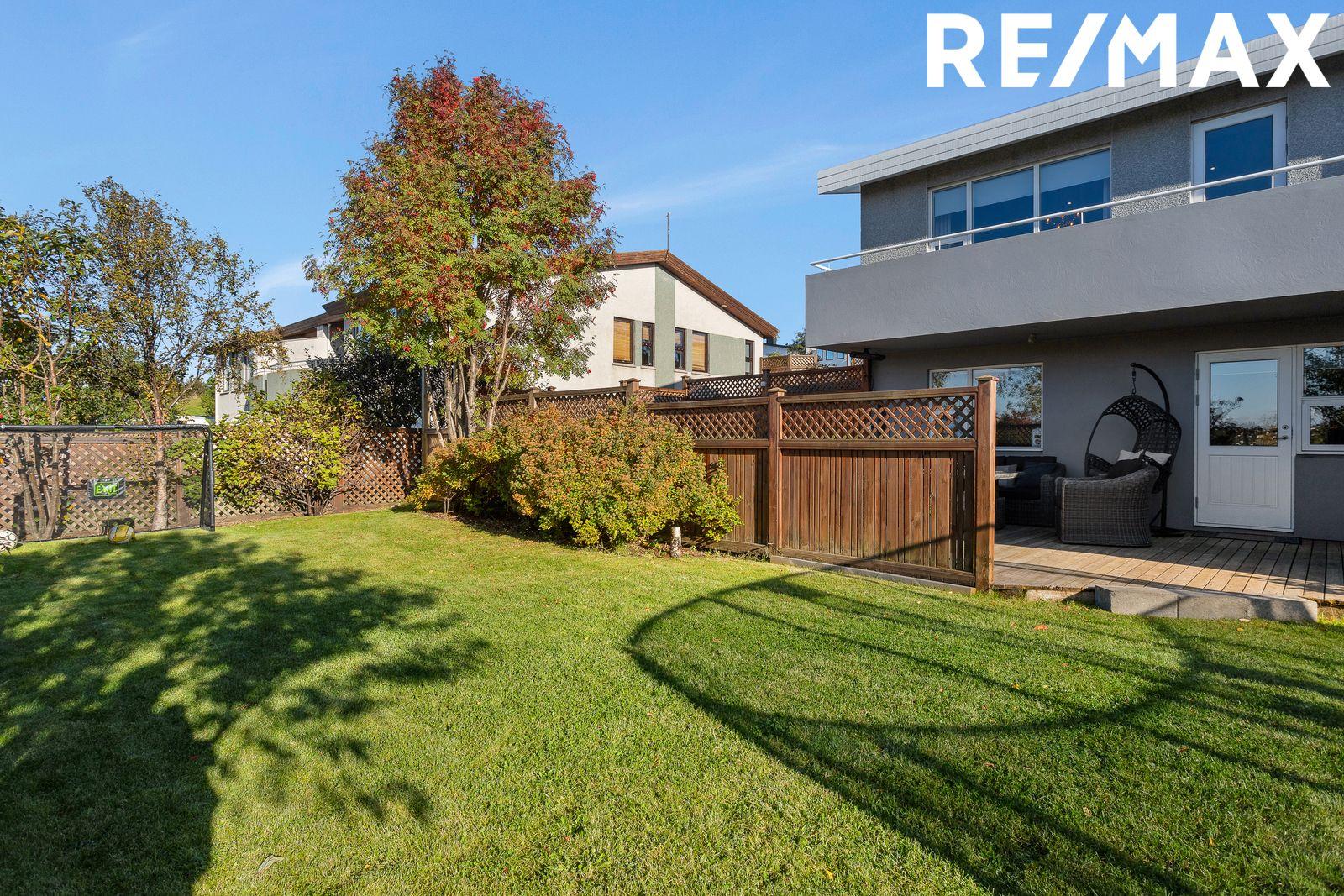 Garður: Hægt er að ganga að garðinum á tvo vegu, bæði frá neðri hæð hússins og einnig gengið niður með hægri hlið eignarinnar. Veröndin er stór með heitum potti , stóru setusvæði og glæsilegu stóru útieldhúsi með lokuðu þaki og því hægt að nýta allt árið. Fyrir framan veröndina eru grasþökur, falleg tré, niðurgrafið trampolín og timburgirðing sem lokar af garðinn. Við hlið hússins er góður geymsluskúr.