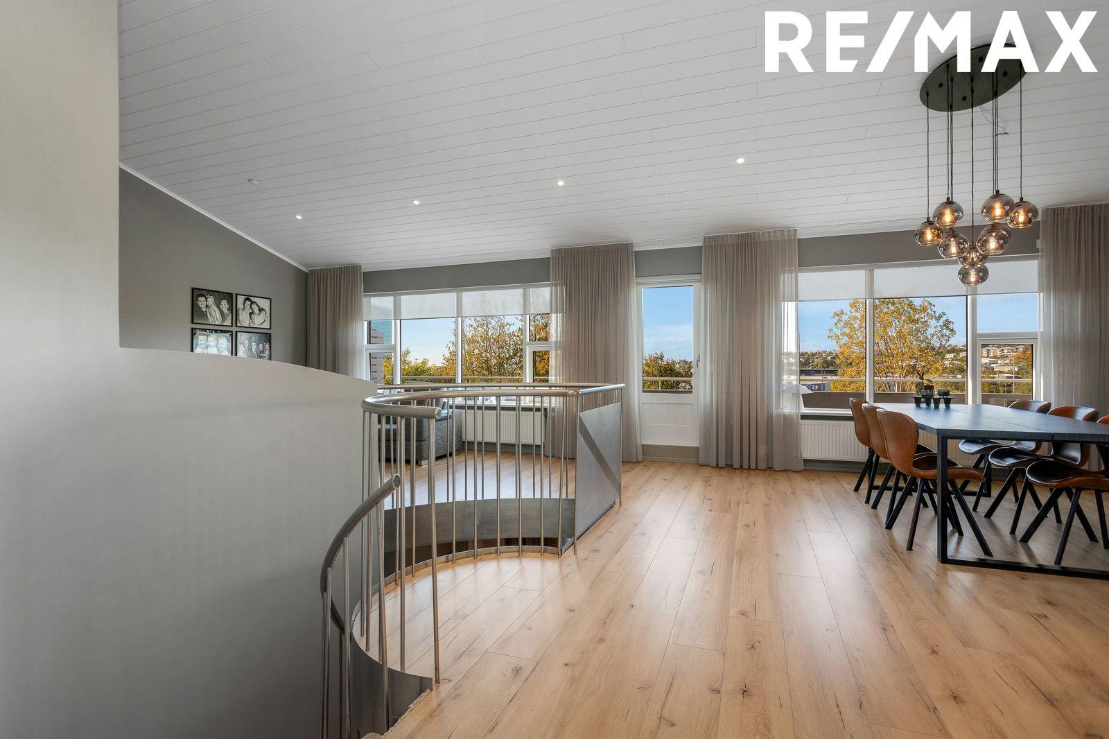 Borðstofa: Fyrir framan eldhúsið er rúmgóð borðstofa. Opið er frá borðstofunni að setustofunni. Á milli borðstofu og setustofunnar er gengið út á góðar útsýnissvalir sem snúa í vestur.