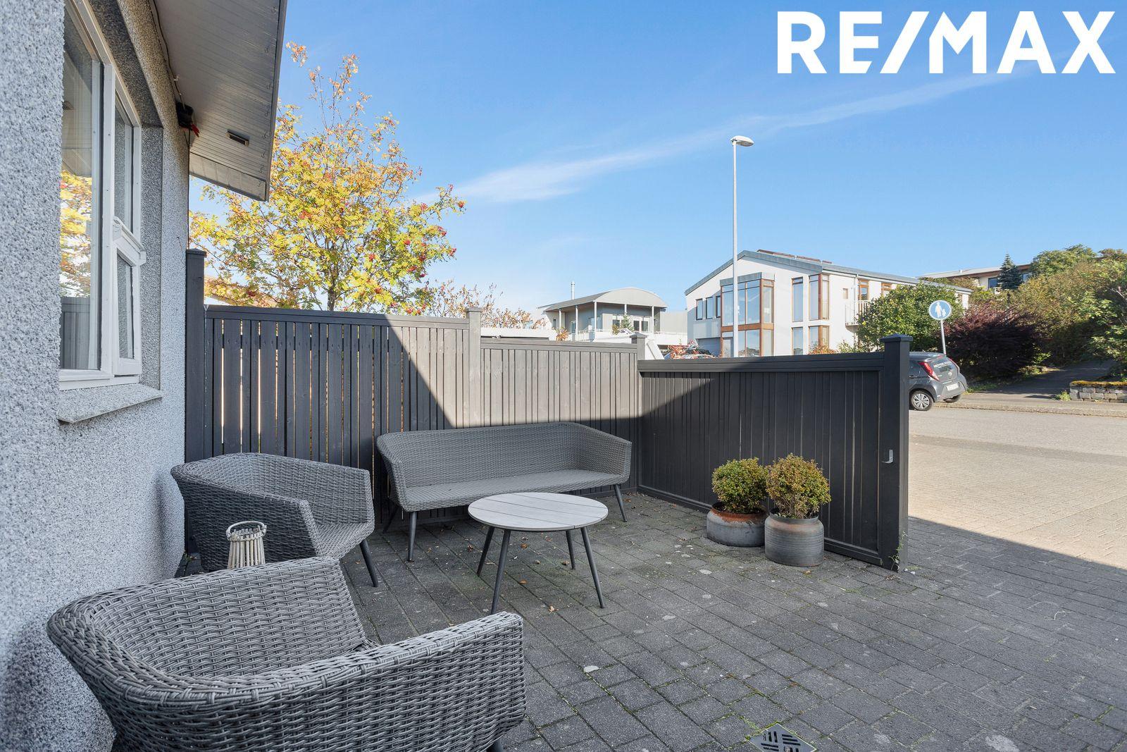 Nánari lýsing eignar:Aðalinngangur eignarinnar er á efri hæð hússins, gengið beint inn af bílaplani hússins. Fyrir framan innganginn er gott bílaplan sem rúmar vel 3 bíla. Einnig er útisvæði með skjólveggjum, einskonar auka verönd. Hægt er að ganga niður að garðinum við hægri gafl hússins.
