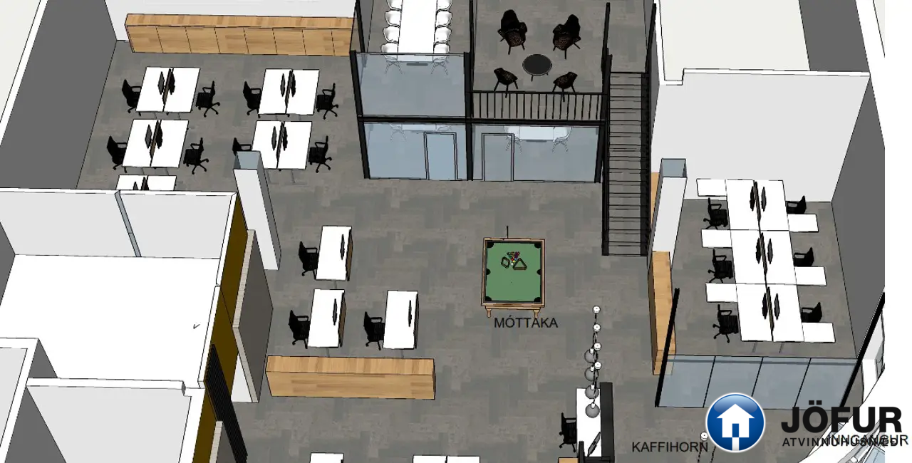 Rýmið er nú innréttað sem skrifstofa með góðu opnu vinnurými, fundarherbergjum og vandaðri kaffiaðstöðu.