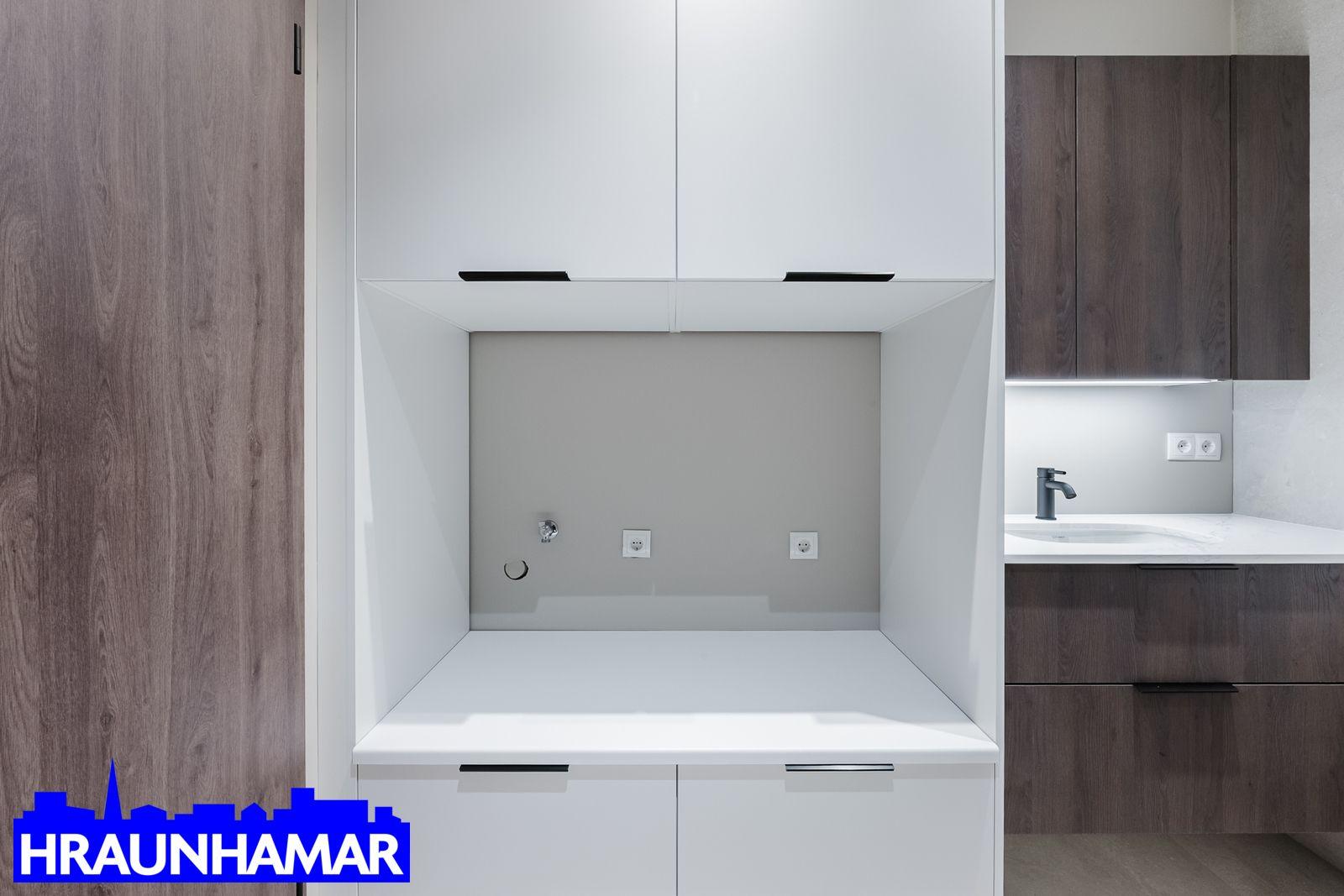 Baðherbergi er með flísum á gólf og veggjum í "walkin" sturtu. Tenging fyrir þvottavél.