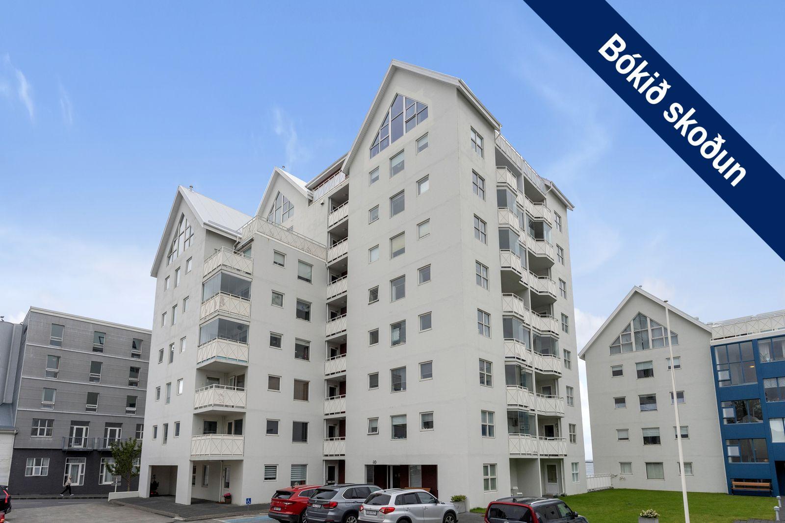 Nánar um eignina: Forstofa með góðu skápaplássi og parketi á gólfi. Stofa rúmgóð með parketi á gólfi. Útgengt er út á góðar svalir. Eldhús með snyrtilegri innréttingu, ofn í vinnuhæð, gert er ráð fyrir ísskáp í innréttingu, helluborð, vifta og parket á gólfi. Svefnherbergi með góðu skápaplássi og parketi á gólfi. Baðherbergi með innangengnum sturtuklefa þar sem er gott aðgengi, snyrtileg innrétting og dúkur á gólfi. Þvottahús/geymsla er innan íbúðar, skolvaskur, hillur, skápur og dúkur á gólfi. Bílastæði í bílakjallara fylgir eigninni, þvottaaðstaða fyrir bíla.