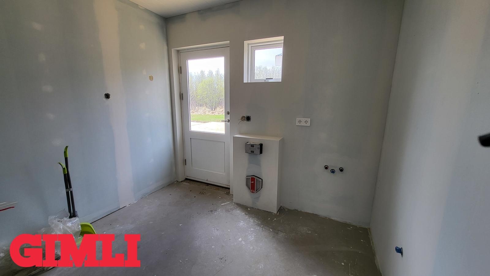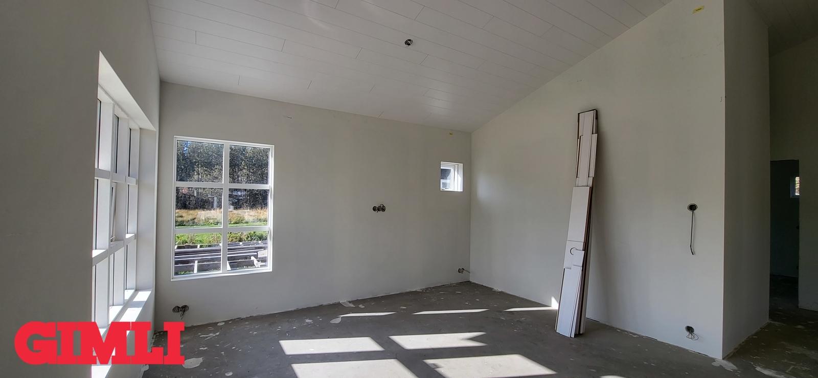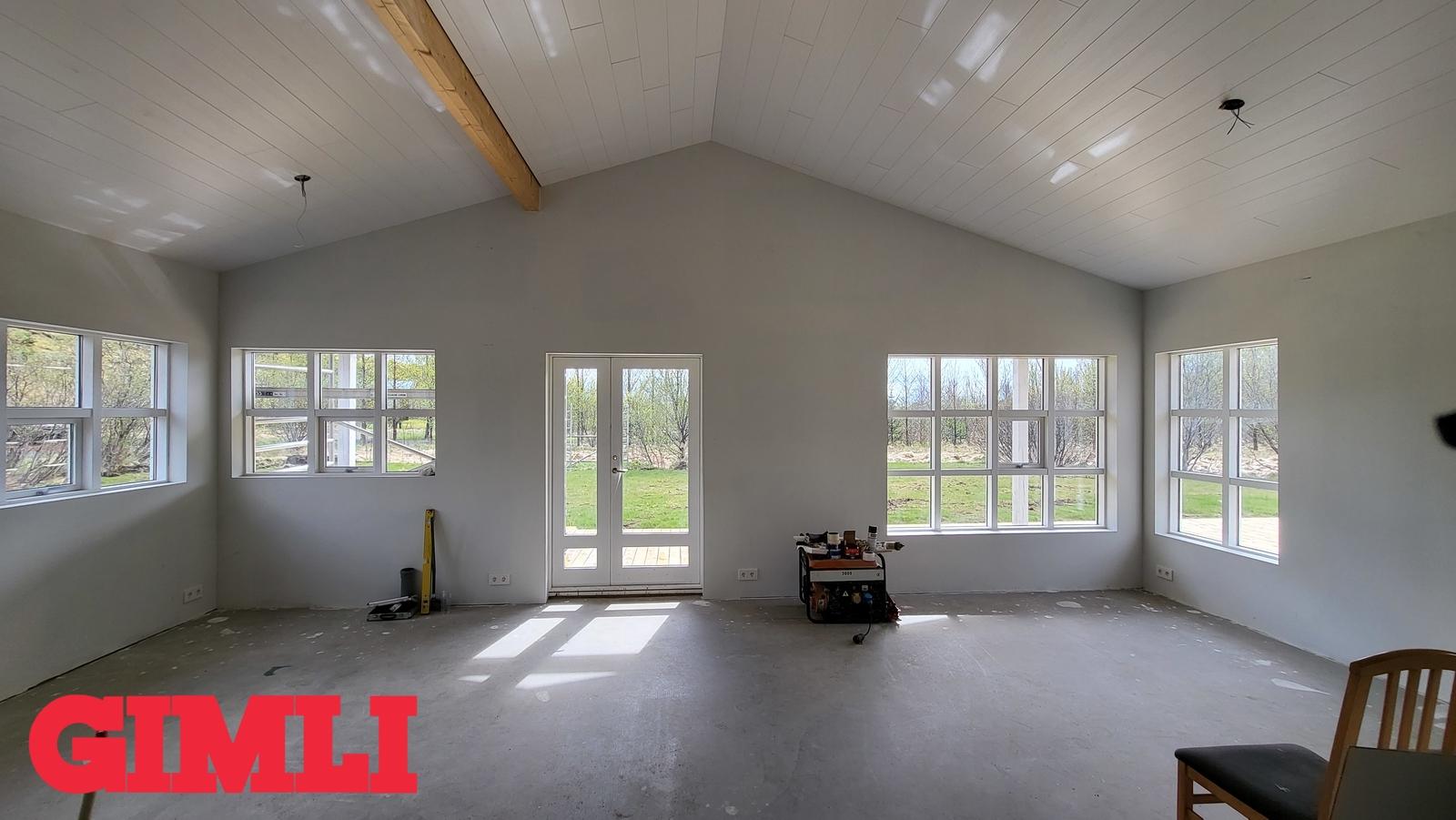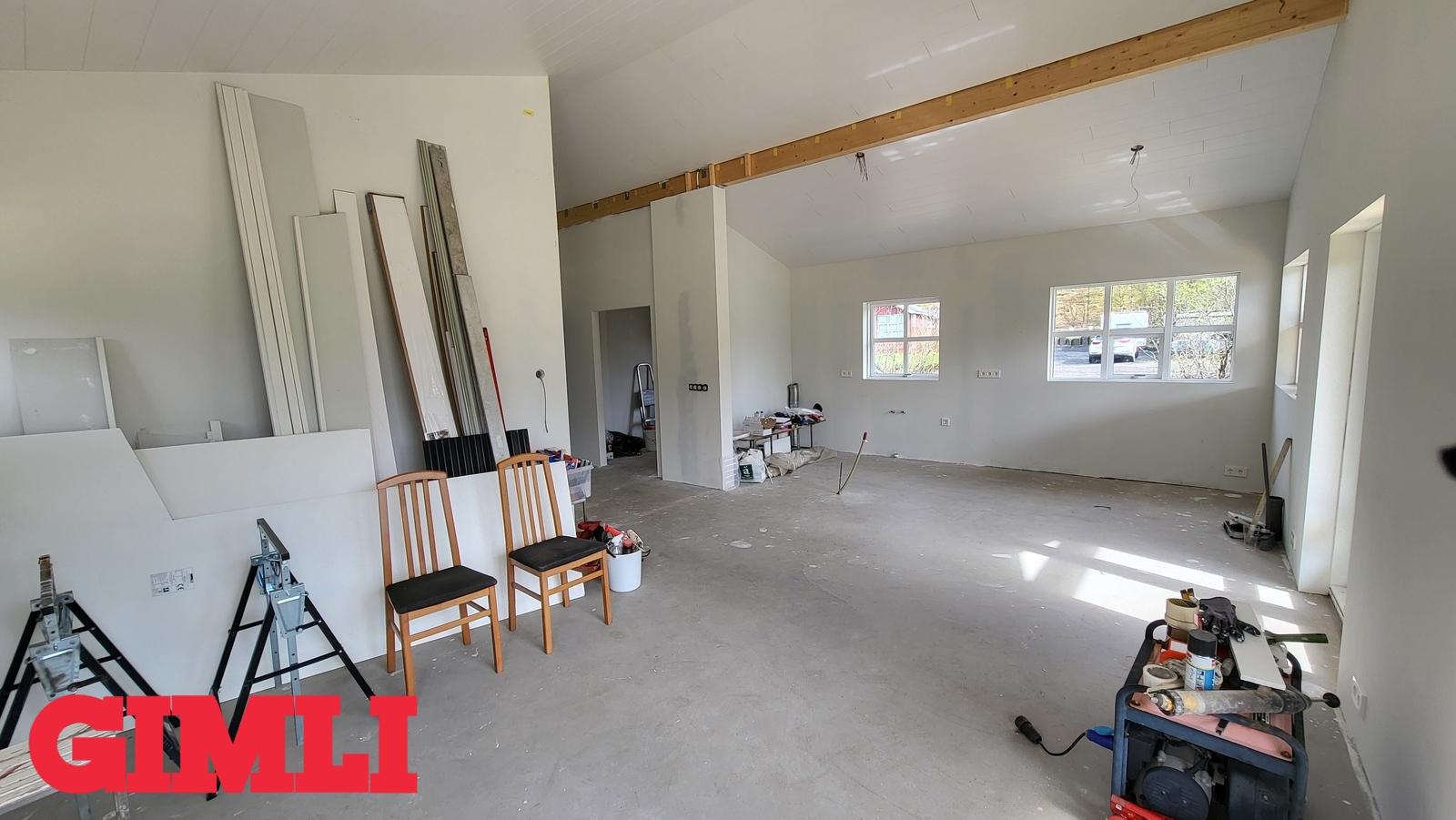 Mikil lofthæð er í húsinu. Steypt plata með frágengnum hitalögnum. Inntakskassi frágenginn. Rotþró tengd og frágenginl. Loft hússins klædd. Allir innveggir komnir með tvöföldu gipsi. Rafmagnstafla frágengin svo og allt rafmagn ídregið með rofum og tenglum.
