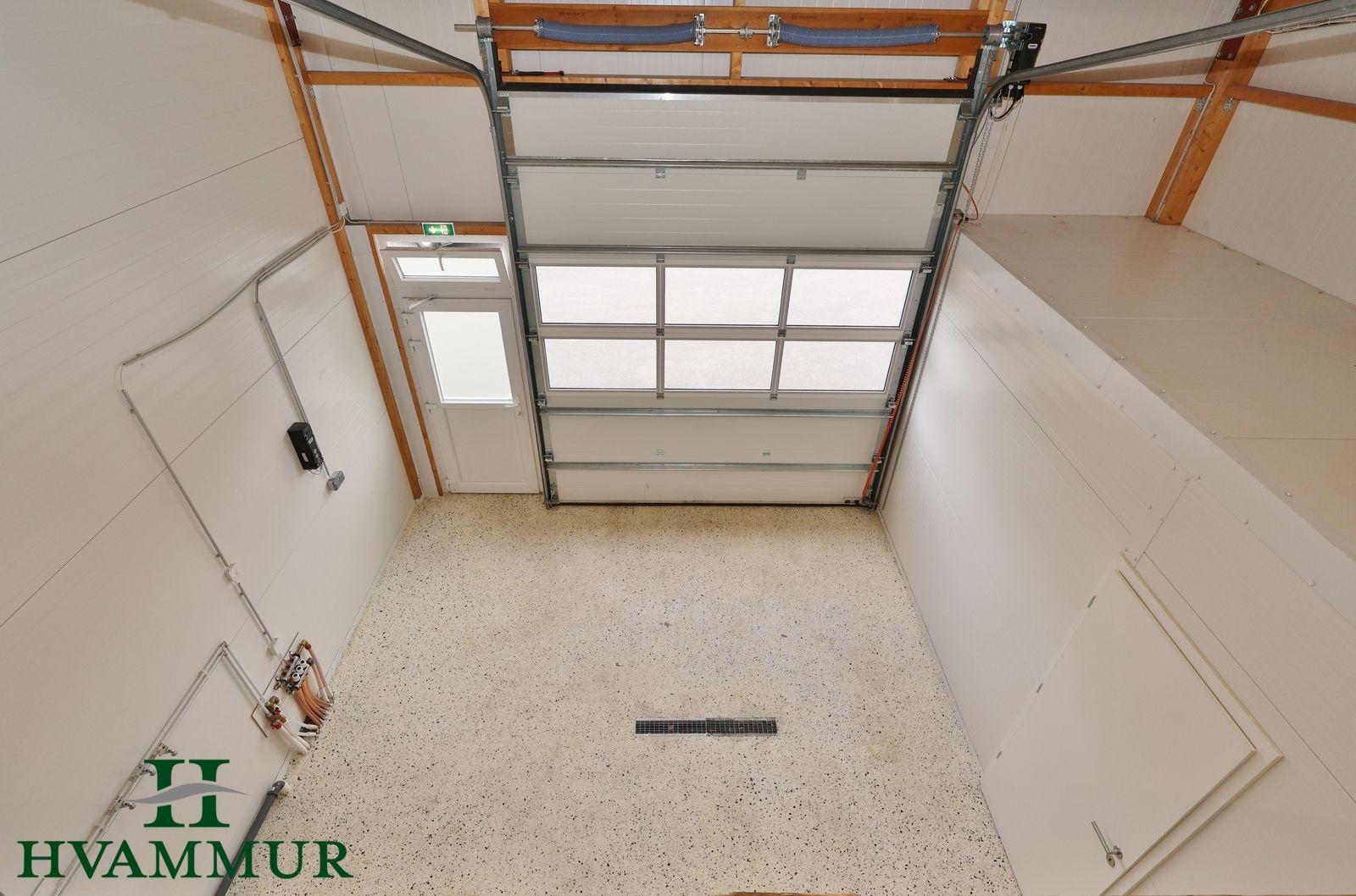 Burðarvirki hússins eru steinsteyptar undirstöður/gólf ásamt timburvirki (límtré) í veggjum og þaki. Útveggir og þak eru klæddir með PIR samlokueiningum. Gólf er lakkað með ljósu epoxy efni. Eignin er 4,5 - 6,3 m á breidd og um um 9 m á dýpt Innkeyrsluhurð er um 3,6 metrar á hæð og með rafdrifnum opnara. Sér gönguhurð. Milliloftið er um 27 m². Snyrting er með upphengdu wc, handlaug og opnanlegum glugga.
