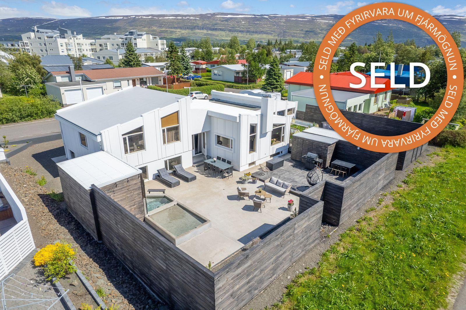 Eikarlundur 20 - Glæsilegt 288,9 fm 8 herbergja einbýlishús á pöllum með tvöföldum bílskúr ásamt stórum steyptum palli með heitum potti, vaðlaug, sauna, sturtuaðstöðu og útieldhúsi.