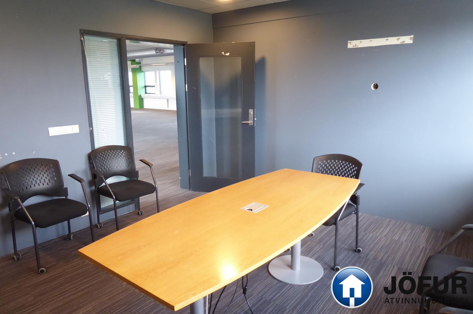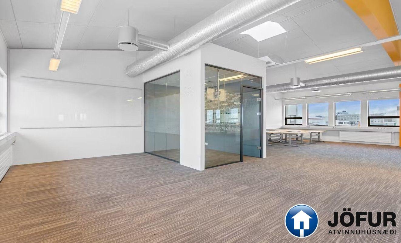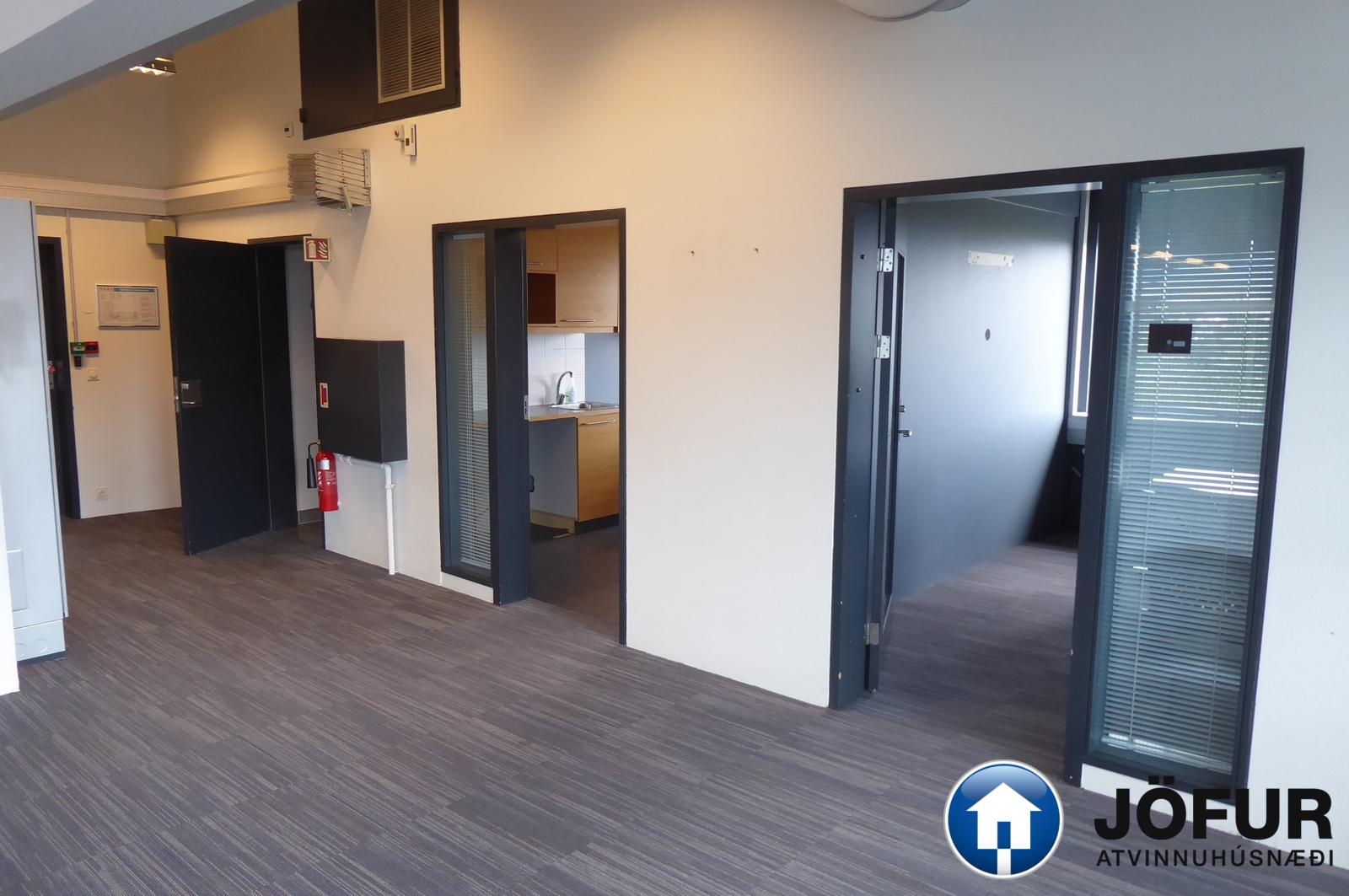 Húsnæðið skiptist í stórt opið vinnurými, tvö fundarherbergi, kaffistofu, tvö salernum og ræstikompu. Loftræstikerfi til staðar. Lyfta er í húsinu. Stórt bílaplan er við húsið og fjöldi bílastæða.