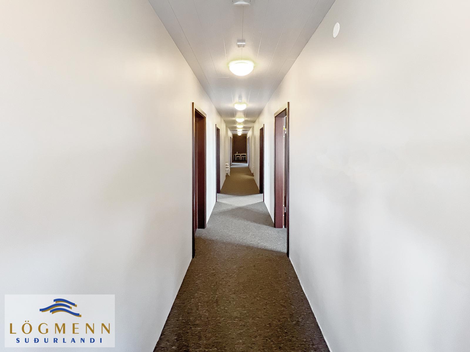 Hótelbygging: Um er að ræða 278 fm. hótelbyggingu sem var tekin í notkun 2019 og er með 8 herbergjum sem hvert er með sér baðherbergi. Sameiginlegur matsalur er á hótelinu og þar er pláss fyrir 16 manns. Herbergjagangur er teppalagður. Herbergin eru teppalögð og hvert baðherbergi er flísalagt í hólf og gólf en á þeim er upphengt salerni, sturta og vaskur. Útgengt er úr hverju herbergi á lóð. Sér þvottahús er á hótelinu og þar er vinylparket á gólfi. Tveir 400L hitakútar eru fyrir hótelið. Gólfhiti er í öllum rýmum hótelsins. Bárujárn er á þaki.
