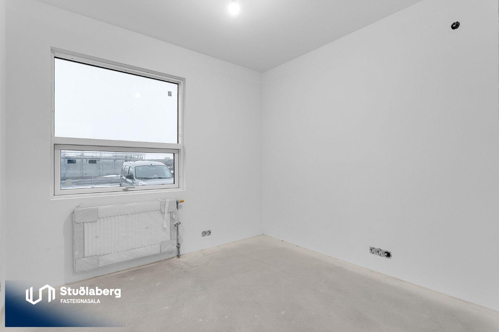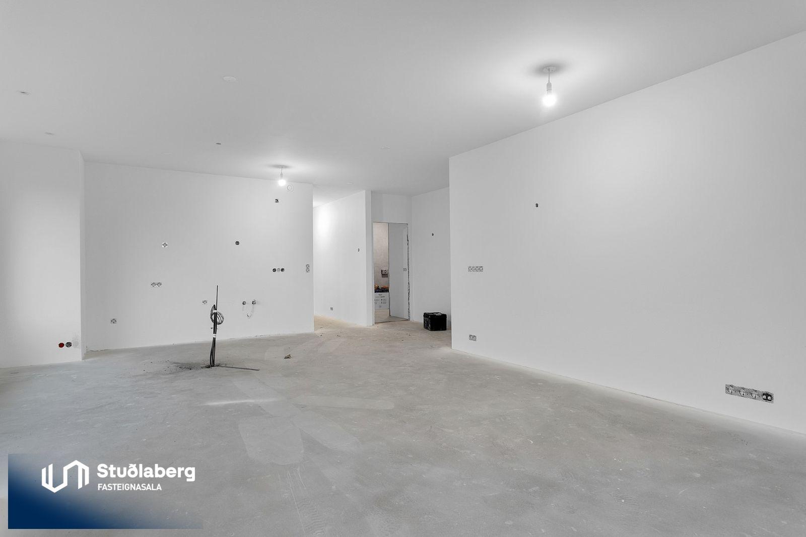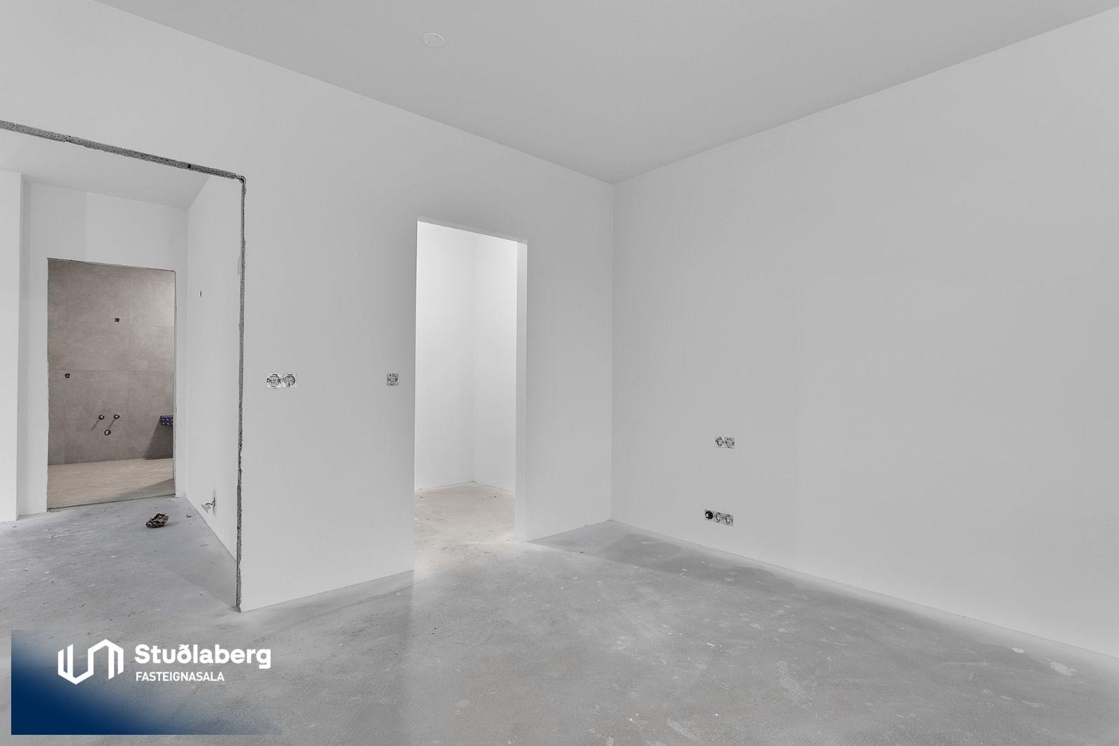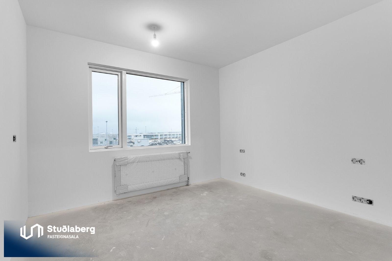 Eignin skilast fullkláruð að utan og innan að undanskyldum gólfefnum í alrými og herbergjum. Flísar eru á votrýmum. Eldhúsinnrétting, klæðaskápar og innihurðar eru vandaðar frá GKS í hnotulit eða í dökk gráum lit. Klæðaskápar eru í forstofu og svefnherbergjum. Í eldhúsi er ofn með blæstri og örbylgjuofn. Helluborð með innbyggðum gufugleypi, kæliskápur með frystihólfi og uppþvottavél fylgja frá Siemnes. Baðherbergin skilast flísalögð á gólfum og veggjum. Dökkar innréttingar frá GKS, speglaskápur, handlaug frá Tengi ehf. Handklæðaofn frá Vatnsvirkjanum, upphengt  salerni með hæglokandi setu frá Ísleifi Jónssyni. Hurðir eru yfirfelldar hvítlakkaðar frá Birgison Lyfta er í húsinu Bílageymsla er í opnu býlskýli á mill húsa. Veggir og loft eru steypt en ekki meðhöndlað frekar. Bílskúrar fylgja ákveðnum íbúðum. Veggir og loft eru slípuð, grunnuð og máluð með tveimur yfirferðum af grárri votrýmismálningu. Epoxy verður á gólfum. Skolvaksur fylgir hverri íbúð. Lóð verður fullfrágengin Bílastæði verða malbikuð og eða hellulögð.