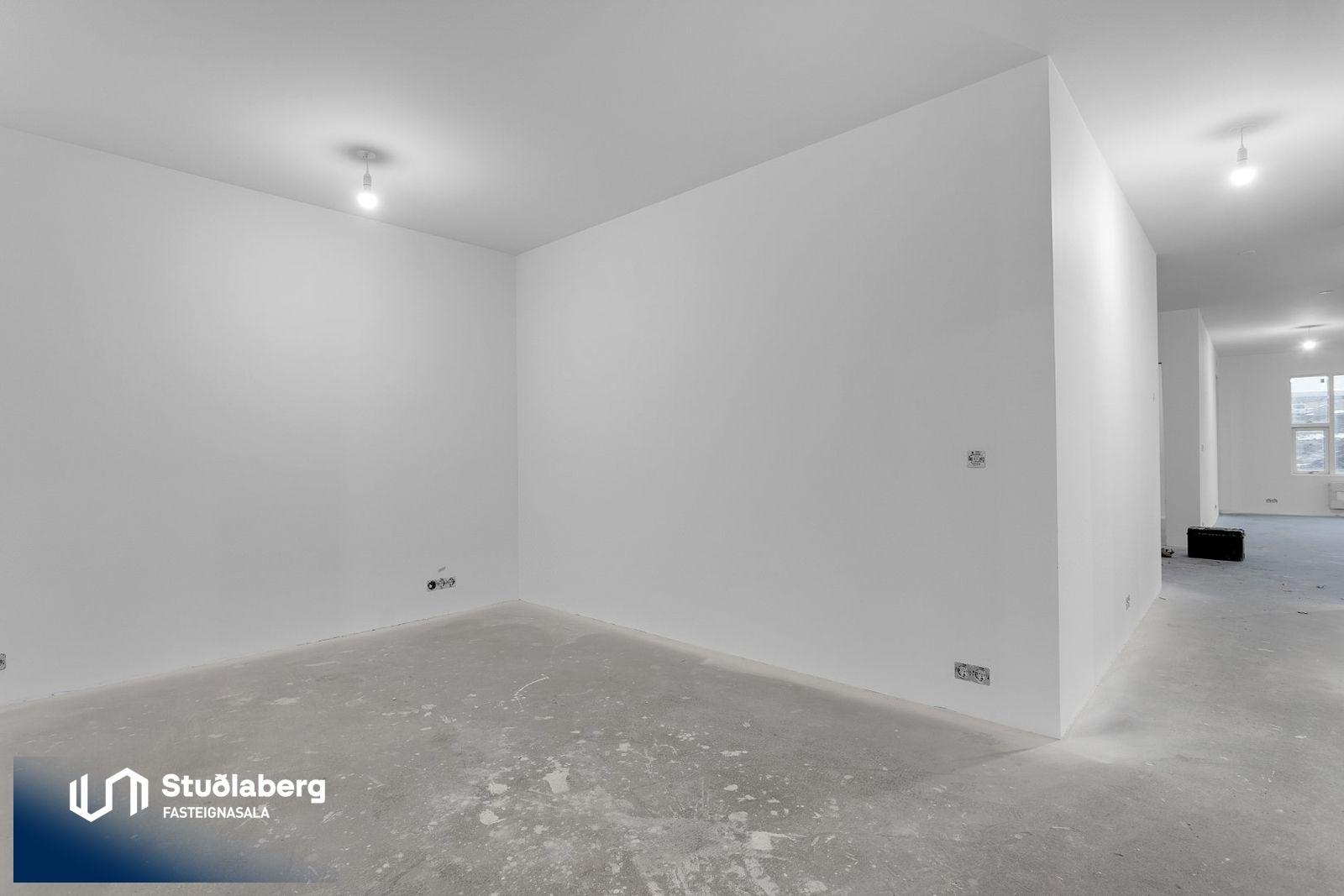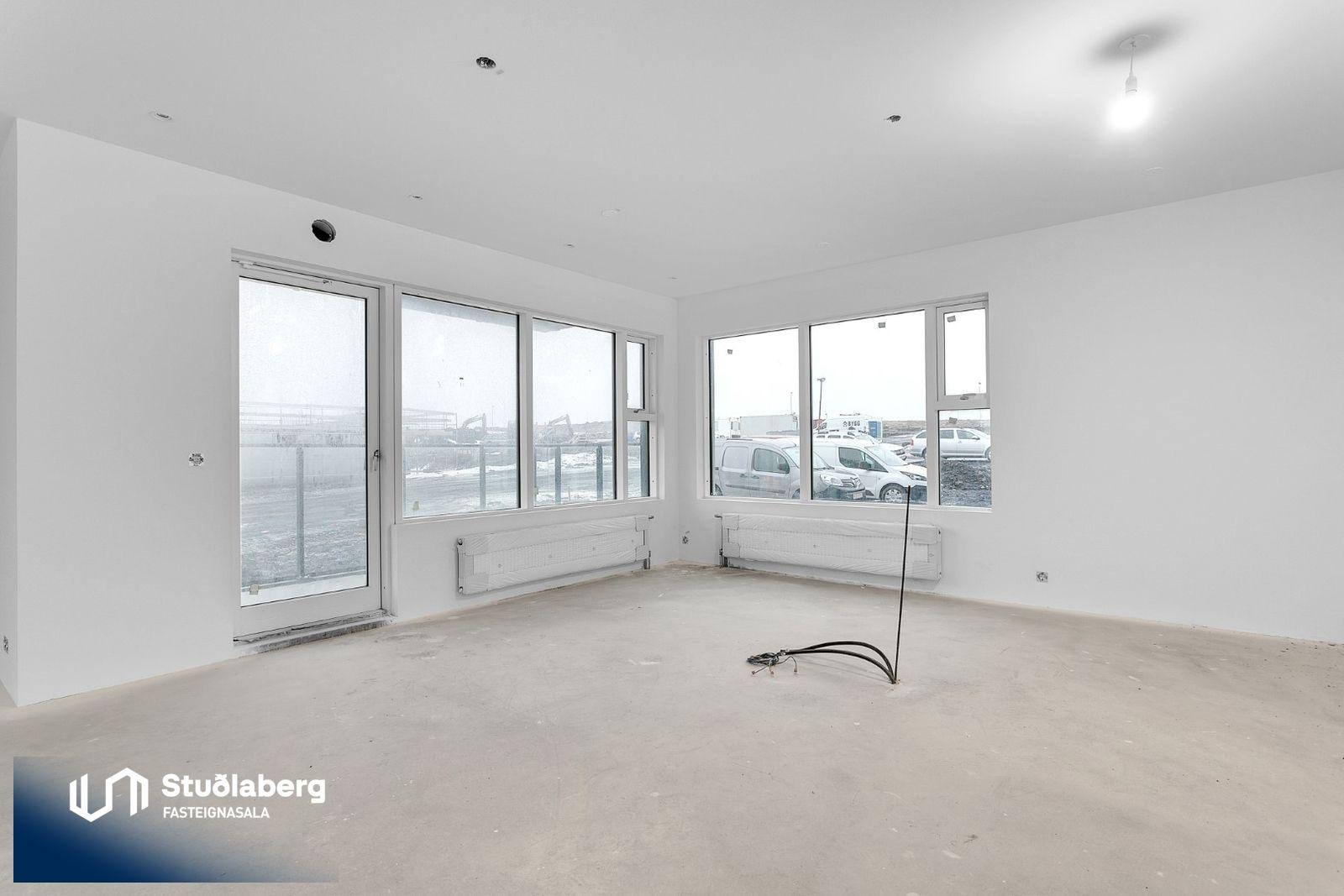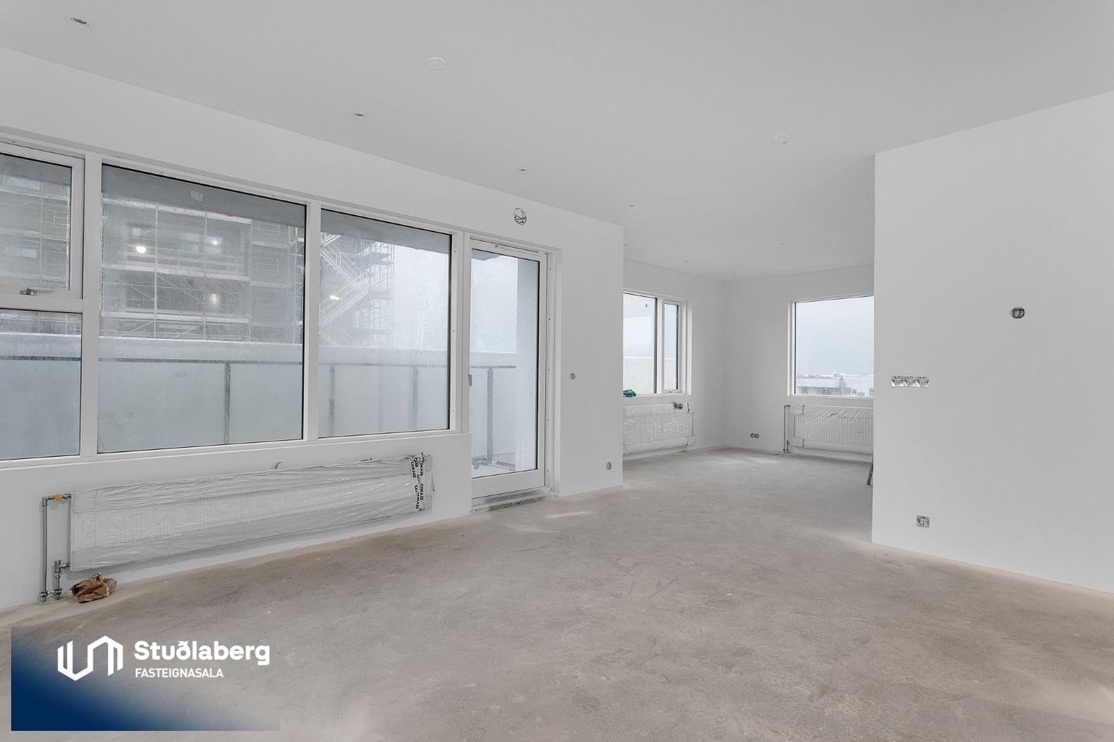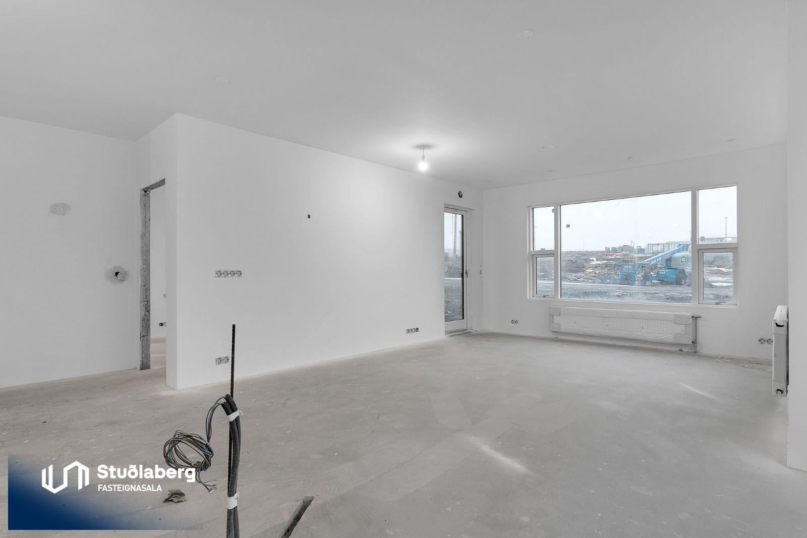 Eignin skilast fullkláruð að utan og innan að undanskyldum gólfefnum í alrými og herbergjum. Flísar eru á votrýmum. Eldhúsinnrétting, klæðaskápar og innihurðar eru vandaðar frá GKS í hnotulit eða í dökk gráum lit. Klæðaskápar eru í forstofu og svefnherbergjum. Í eldhúsi er ofn með blæstri og örbylgjuofn. Helluborð með innbyggðum gufugleypi, kæliskápur með frystihólfi og uppþvottavél fylgja frá Siemnes. Baðherbergin skilast flísalögð á gólfum og veggjum. Dökkar innréttingar frá GKS, speglaskápur, handlaug frá Tengi ehf. Handklæðaofn frá Vatnsvirkjanum, upphengt  salerni með hæglokandi setu frá Ísleifi Jónssyni. Hurðir eru yfirfelldar hvítlakkaðar frá Birgison Lyfta er í húsinu Bílageymsla er í opnu býlskýli á mill húsa. Veggir og loft eru steypt en ekki meðhöndlað frekar. Bílskúrar fylgja ákveðnum íbúðum. Veggir og loft eru slípuð, grunnuð og máluð með tveimur yfirferðum af grárri votrýmismálningu. Epoxy verður á gólfum. Skolvaksur fylgir hverri íbúð. Lóð verður fullfrágengin Bílastæði verða malbikuð og eða hellulögð.