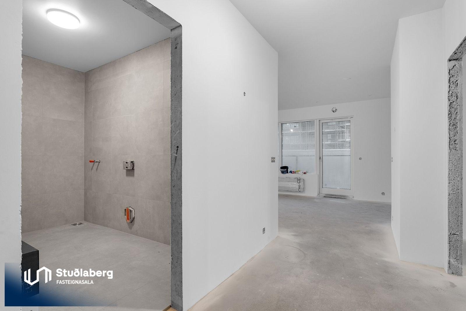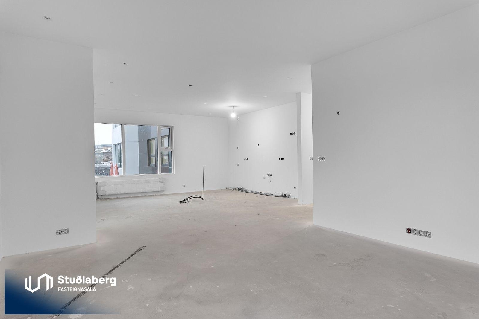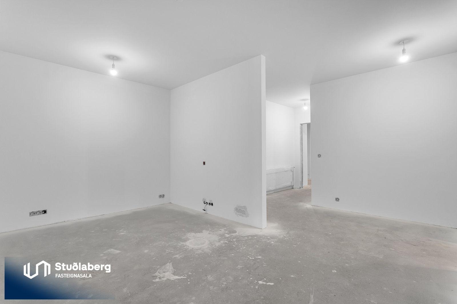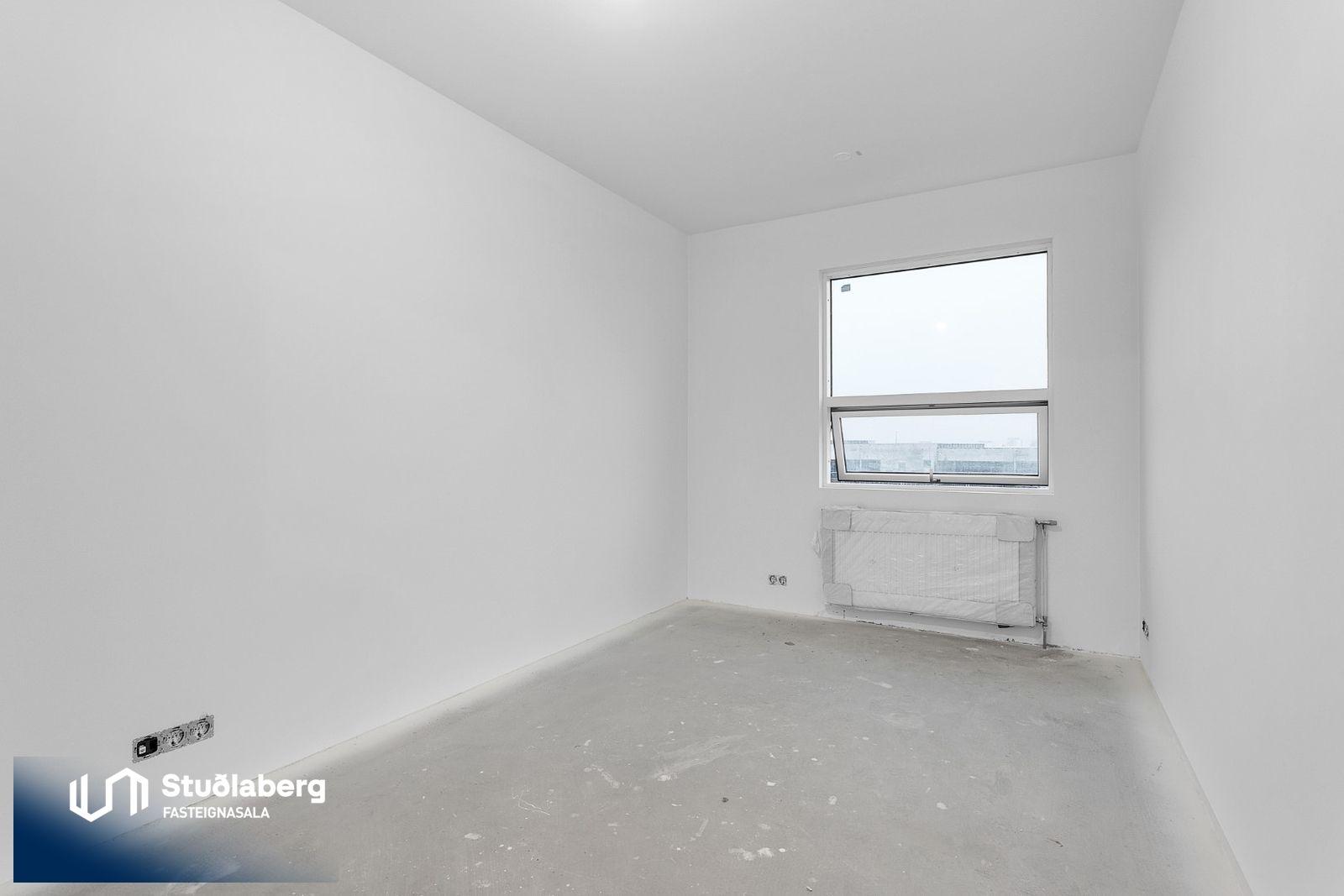 Eignin skilast fullkláruð að utan og innan að undanskyldum gólfefnum í alrými og herbergjum. Flísar eru á votrýmum. Eldhúsinnrétting, klæðaskápar og innihurðar eru vandaðar frá GKS í hnotulit eða í dökk gráum lit. Klæðaskápar eru í forstofu og svefnherbergjum. Í eldhúsi er ofn með blæstri og örbylgjuofn. Helluborð með innbyggðum gufugleypi, kæliskápur með frystihólfi og uppþvottavél fylgja frá Siemnes. Baðherbergin skilast flísalögð á gólfum og veggjum. Dökkar innréttingar frá GKS, speglaskápur, handlaug frá Tengi ehf. Handklæðaofn frá Vatnsvirkjanum, upphengt  salerni með hæglokandi setu frá Ísleifi Jónssyni. Hurðir eru yfirfelldar hvítlakkaðar frá Birgison Lyfta er í húsinu Bílageymsla er í opnu býlskýli á mill húsa. Veggir og loft eru steypt en ekki meðhöndlað frekar. Bílskúrar fylgja ákveðnum íbúðum. Veggir og loft eru slípuð, grunnuð og máluð með tveimur yfirferðum af grárri votrýmismálningu. Epoxy verður á gólfum. Skolvaksur fylgir hverri íbúð. Lóð verður fullfrágengin Bílastæði verða malbikuð og eða hellulögð.