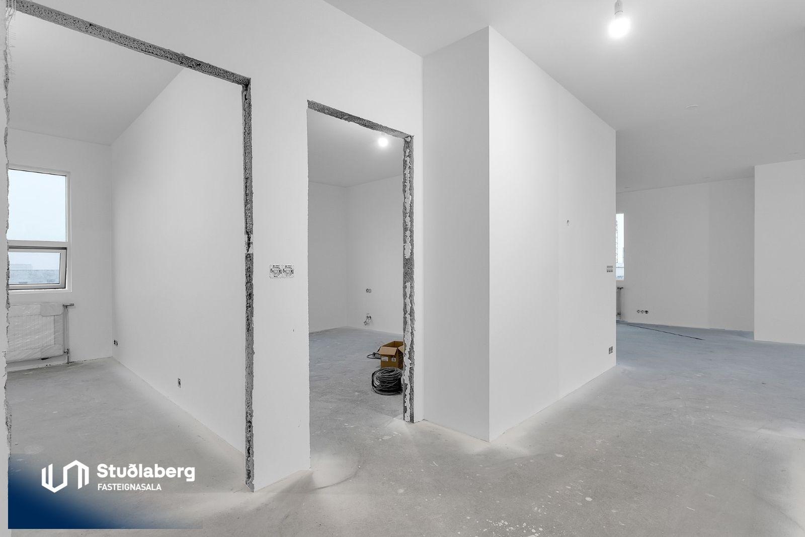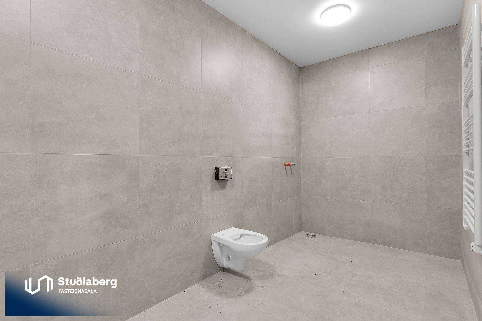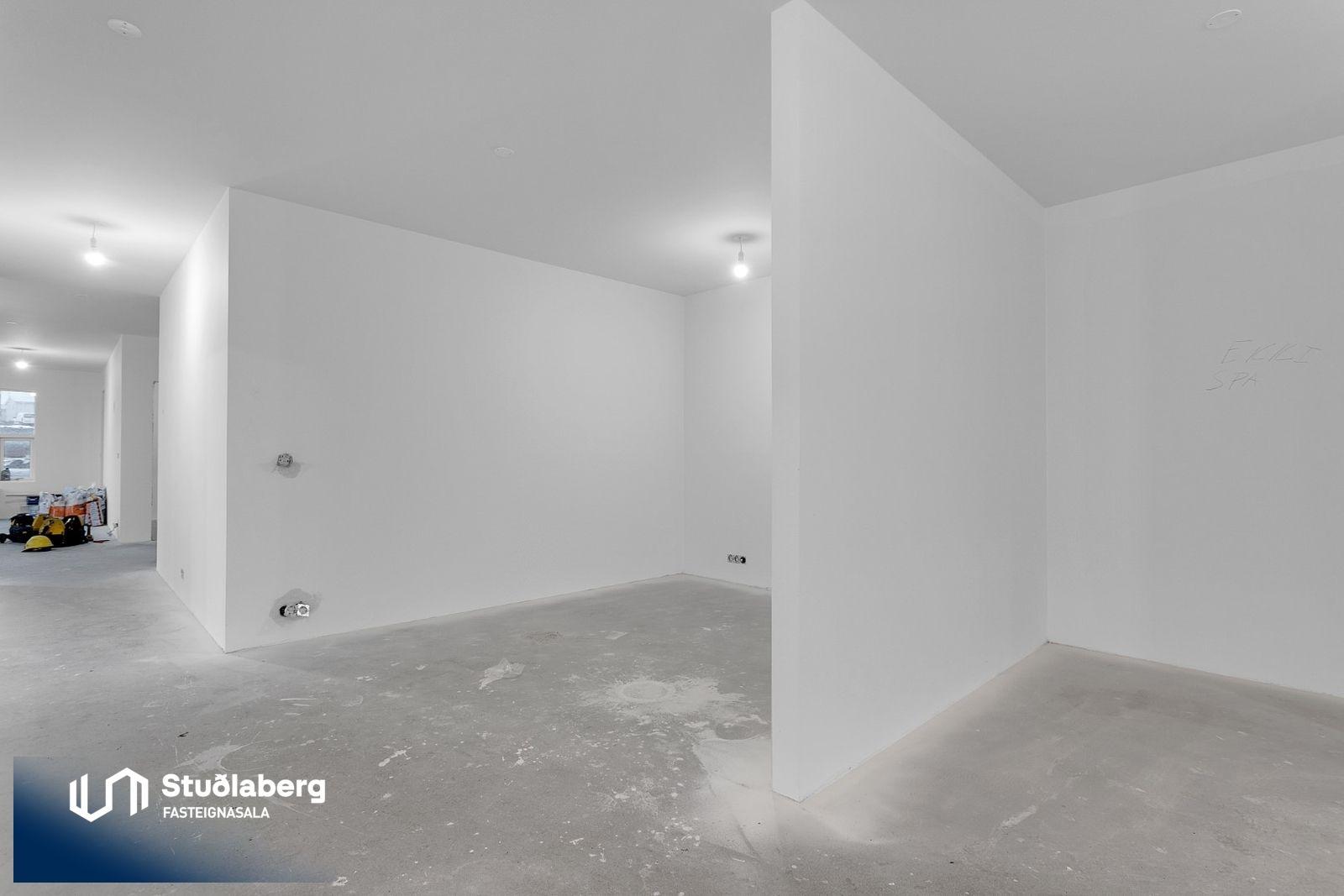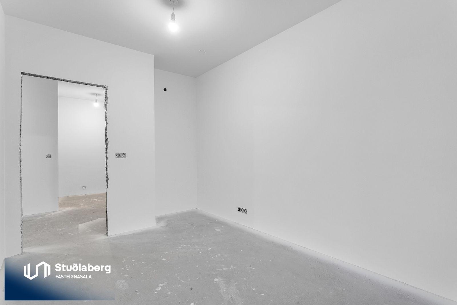 Eignin skilast fullkláruð að utan og innan að undanskyldum gólfefnum í alrými og herbergjum. Flísar eru á votrýmum. Eldhúsinnrétting, klæðaskápar og innihurðar eru vandaðar frá GKS í hnotulit eða í dökk gráum lit. Klæðaskápar eru í forstofu og svefnherbergjum. Í eldhúsi er ofn með blæstri og örbylgjuofn. Helluborð með innbyggðum gufugleypi, kæliskápur með frystihólfi og uppþvottavél fylgja frá Siemnes. Baðherbergin skilast flísalögð á gólfum og veggjum. Dökkar innréttingar frá GKS, speglaskápur, handlaug frá Tengi ehf. Handklæðaofn frá Vatnsvirkjanum, upphengt  salerni með hæglokandi setu frá Ísleifi Jónssyni. Hurðir eru yfirfelldar hvítlakkaðar frá Birgison Lyfta er í húsinu Bílageymsla er í opnu býlskýli á mill húsa. Veggir og loft eru steypt en ekki meðhöndlað frekar. Bílskúrar fylgja ákveðnum íbúðum. Veggir og loft eru slípuð, grunnuð og máluð með tveimur yfirferðum af grárri votrýmismálningu. Epoxy verður á gólfum. Skolvaksur fylgir hverri íbúð. Lóð verður fullfrágengin Bílastæði verða malbikuð og eða hellulögð.