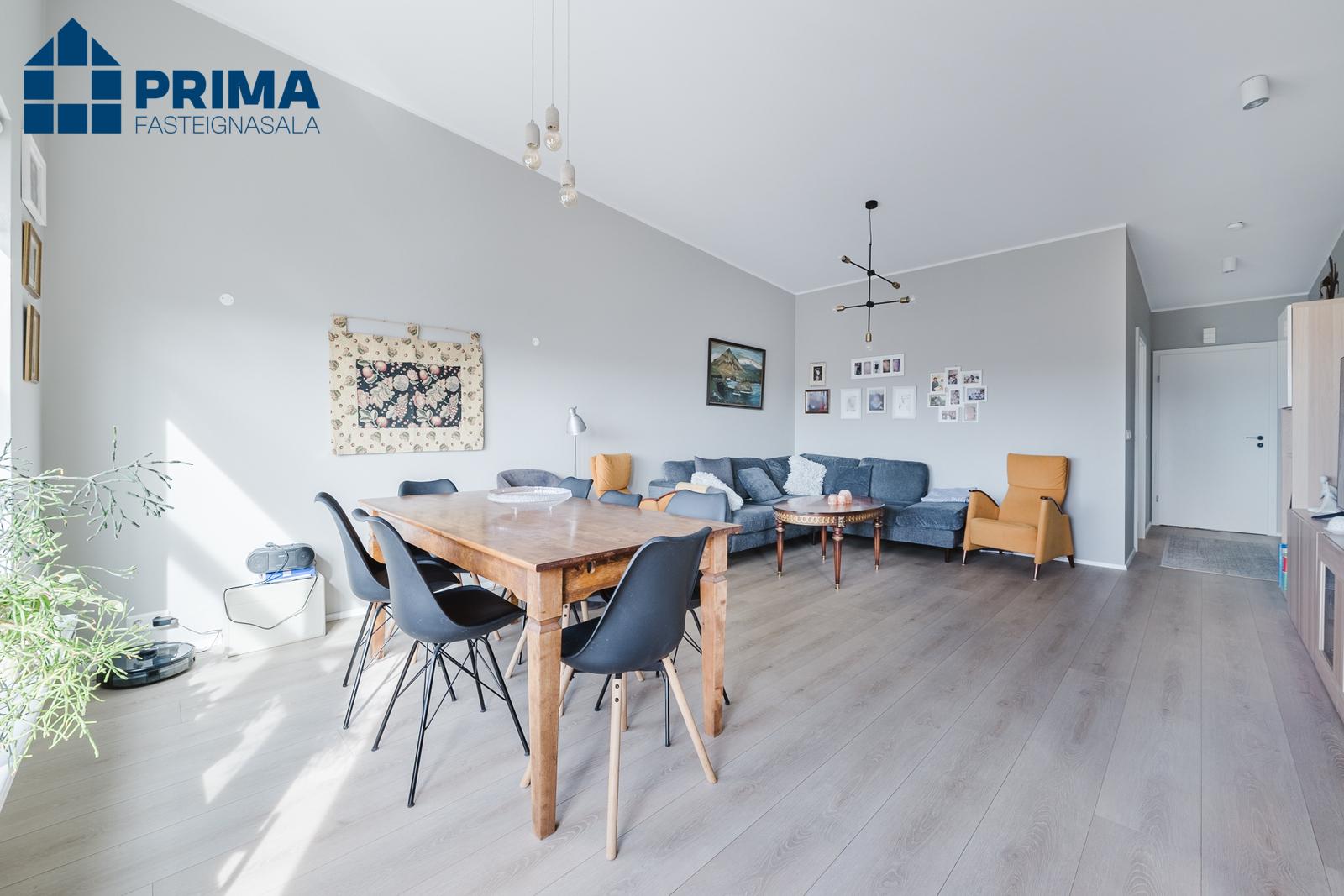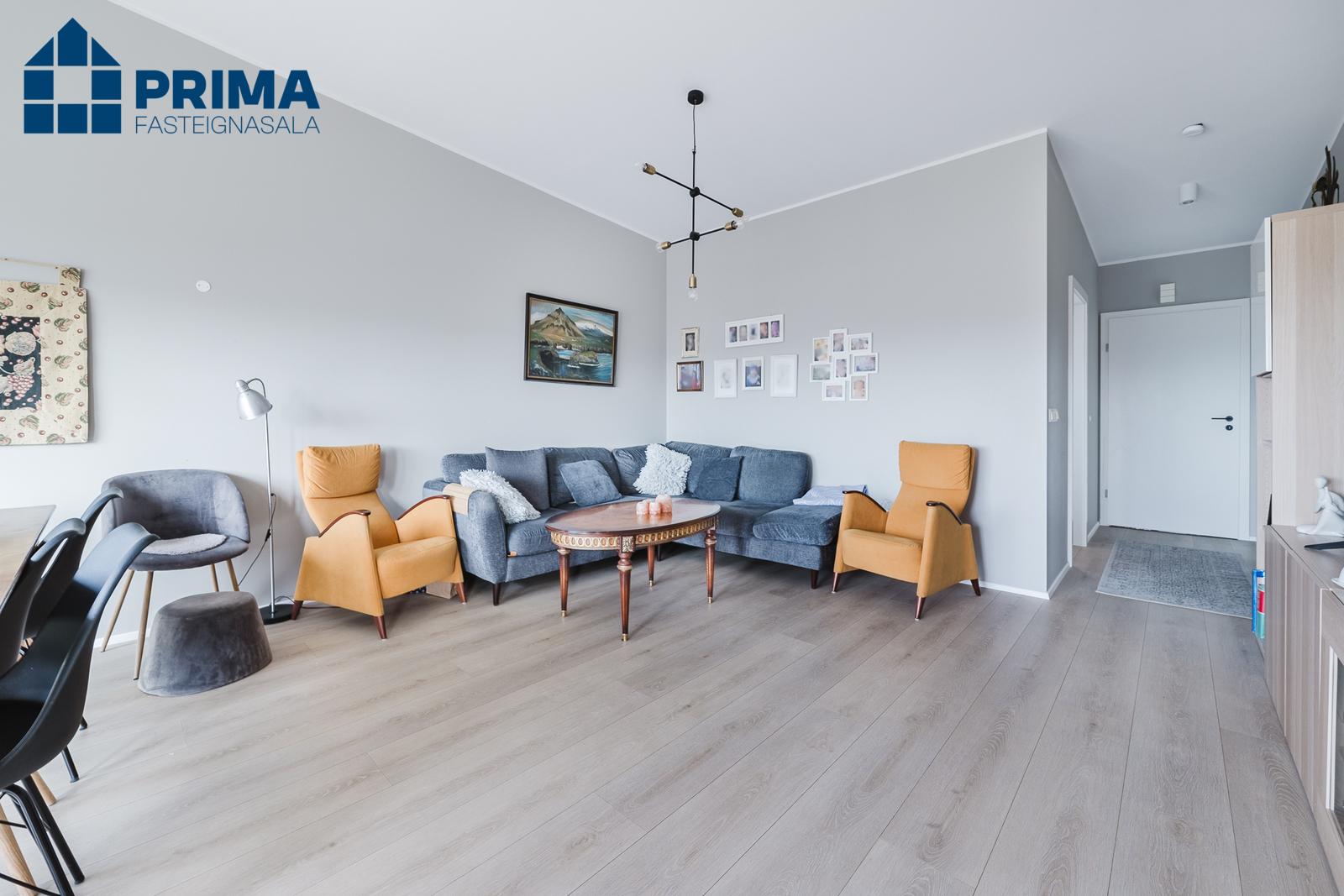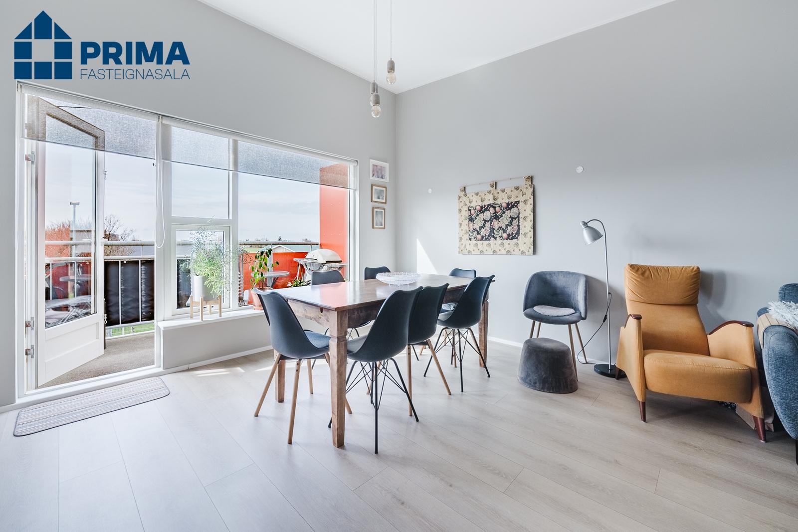 stofa með aukinni lofthæð. flæðandi parket. Úr stofu/borðstofu er gengið út á suðursvalir.