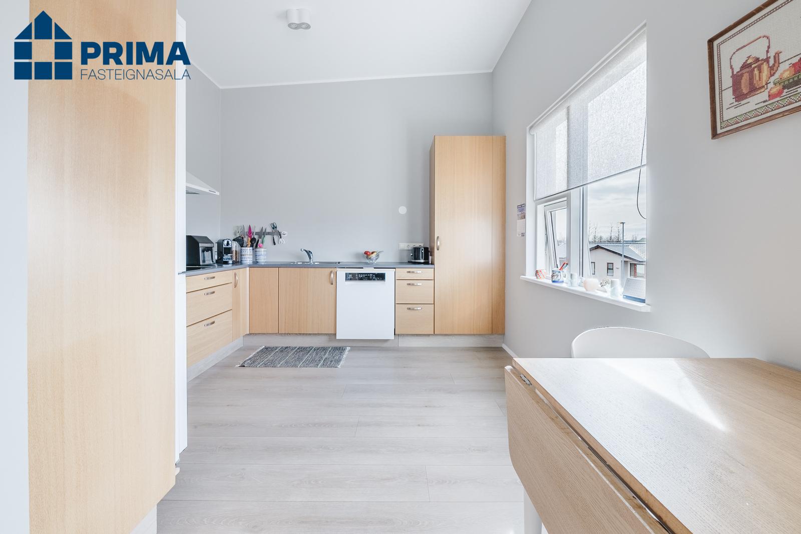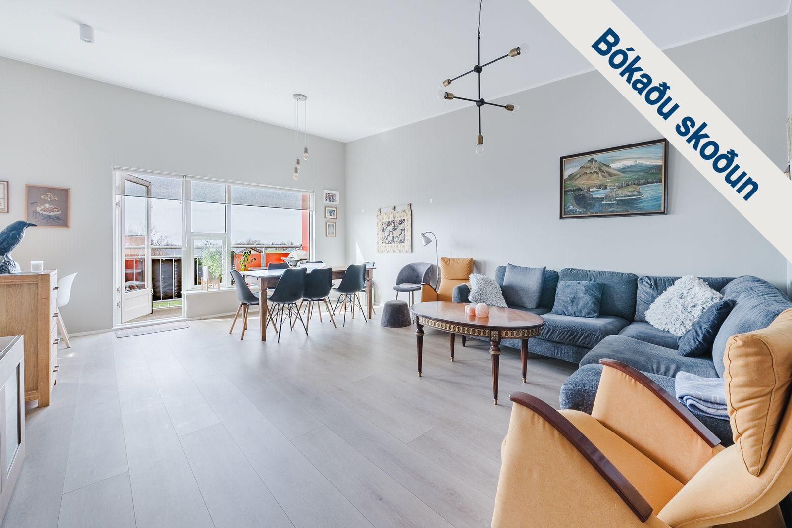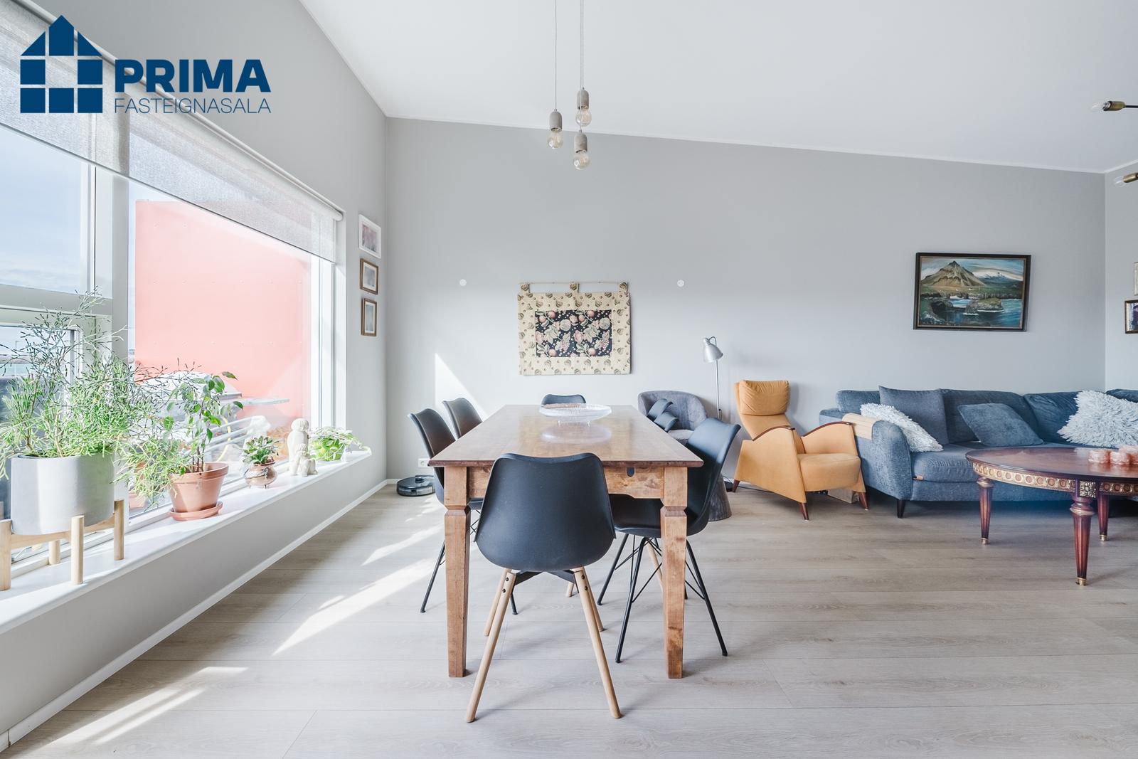 *** Smáraflöt 5 - 300 Akranes *** PRIMA Fasteignasala og Oliver Bergmann lögg.fasteignasali kynna: Afar falleg, snyrtileg og vel skipulögð 97.5 fm 3ja herb. íbúð á efstu hæð í fjölbýli. Eignin skiptist í forstofu, hol, björt og rúmgóð stofa sem og borðstofu með aukinni lofthæð og suður svölum, eldhús með borðkrók, þvottahús og geymsla innaf eldhúsi, 2 svefnherbergi, og baðherbergi.