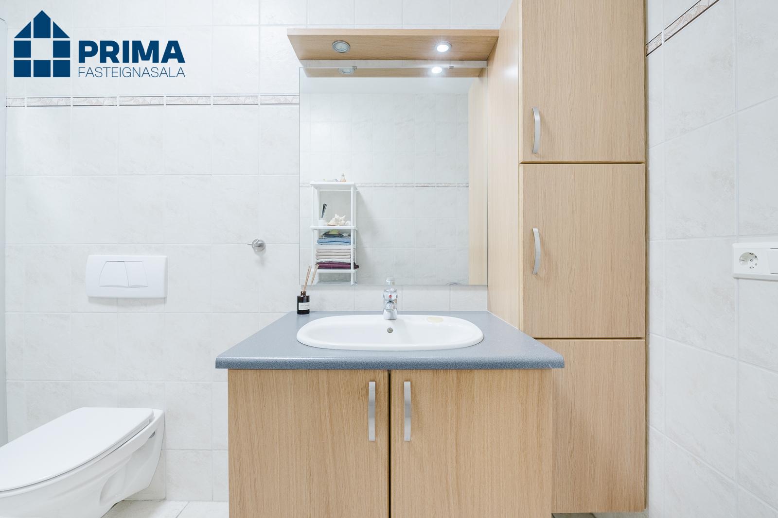 Baðherbergi: Flísalagt í hólf og gólf, innrétting og sturta.