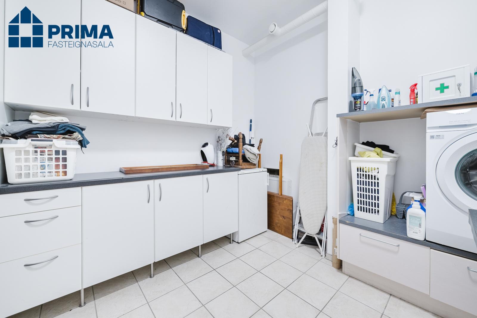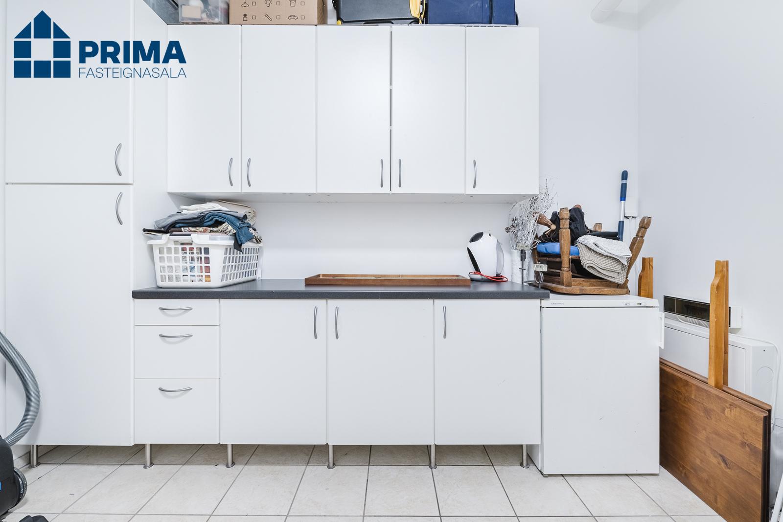 geymsla/þvottahús, vélar i vinnuhæð, skolvaskur, neðri og efri skápar og hillur. flísar á gólfi.