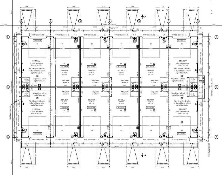Nánari lýsing: Húsið er á einni hæð og skiptist í 12 einingar sem allar eru geymsla eða geymsla/léttur iðnaður, hver eining er 72m2 að birtu flatarmáli. Lóðin verður malbikuð, gert ráð fyrir einu bílastæði fyrir framan hverja starfseiningu.