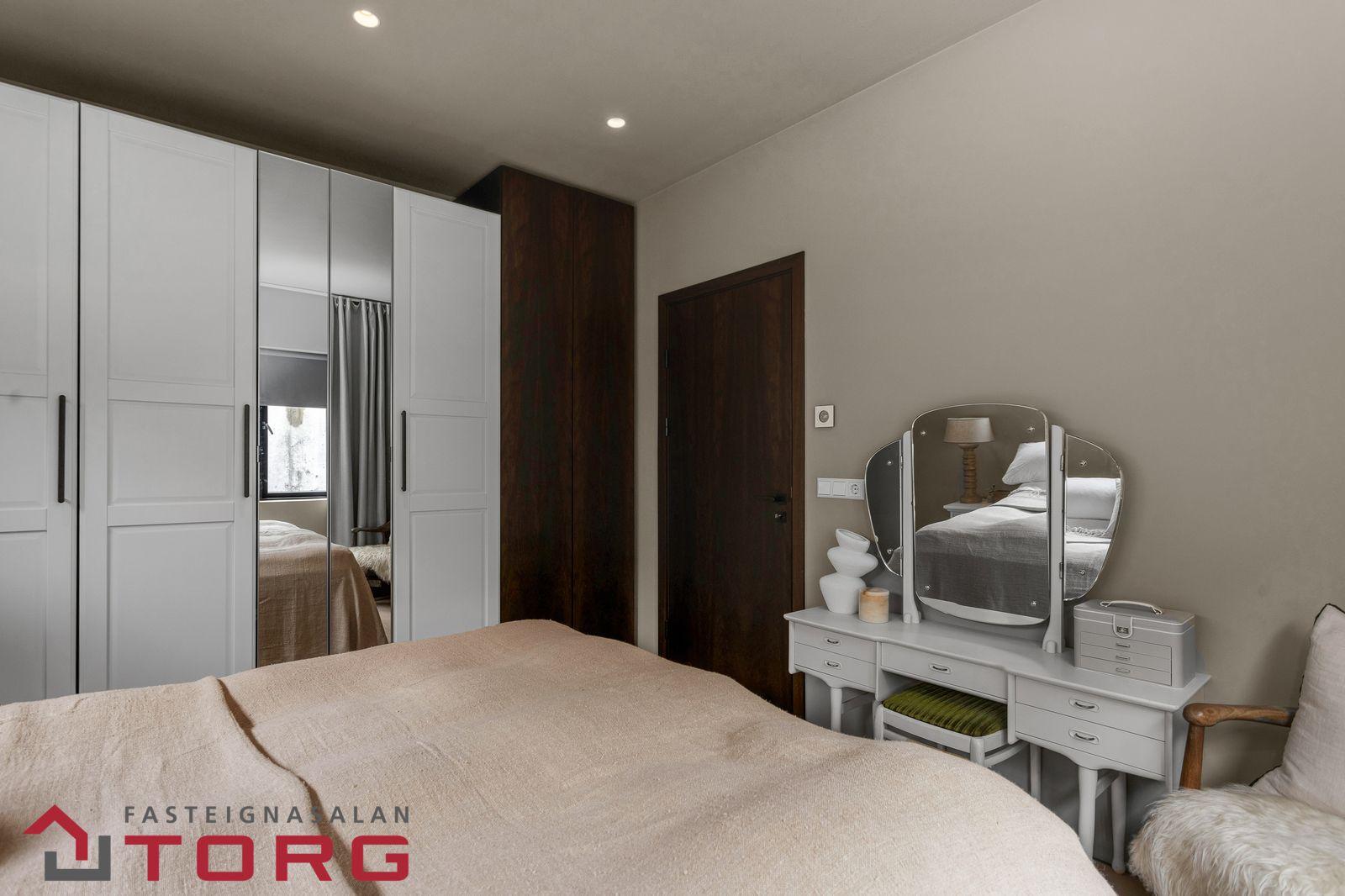 Svefnherbergi: svefnherbergið er rúmgott með góðum fataskápum og parketi á gólfi. Á upphaflegri teikningu er gert ráð fyrir að þetta rými sé sjónvarpsstofa, þá væru skápar í þessu herbergi færðir í hjónasvítu. Búið er að gera ráð fyrir að þeir passi í rýmið sem nú er notað sem skrifstofuaðstaða.