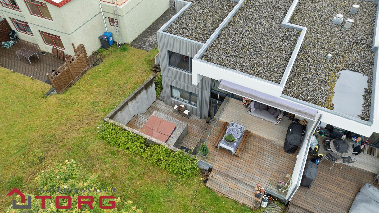 Garður og aðkoma: aðkoman er falleg, hellulagt bílaplan með hitaílögnum, steyptir veggir með lýsingu, verönd úr harðvið og heitur pottur. Í garðinum er svokallað úthagatorf í stað hefðbundins grass, krefst mjög lítillar umhirðu.