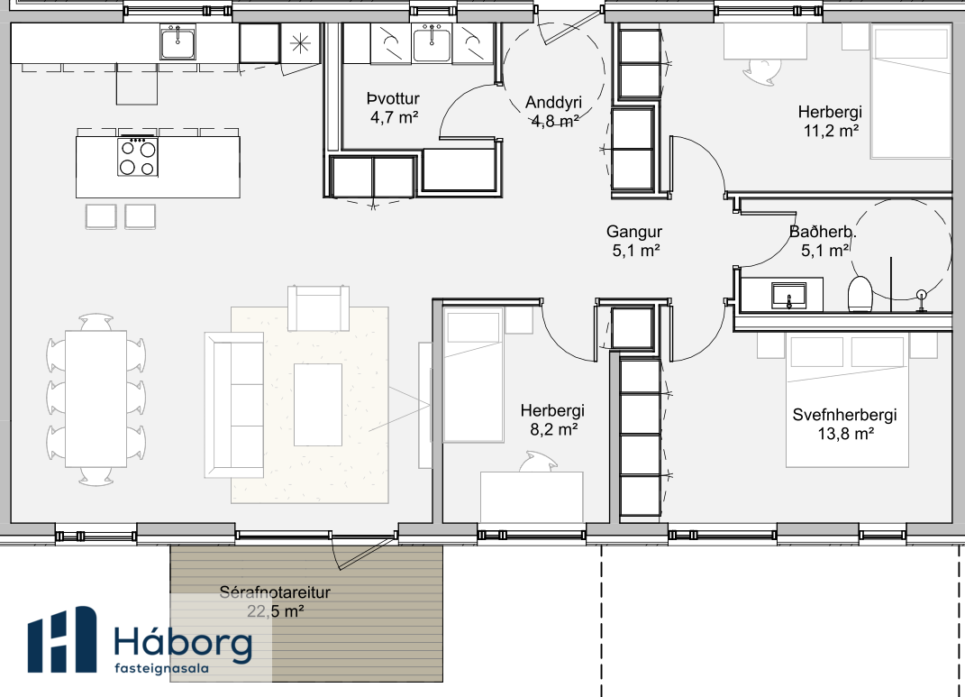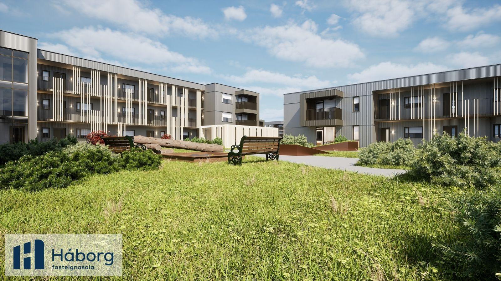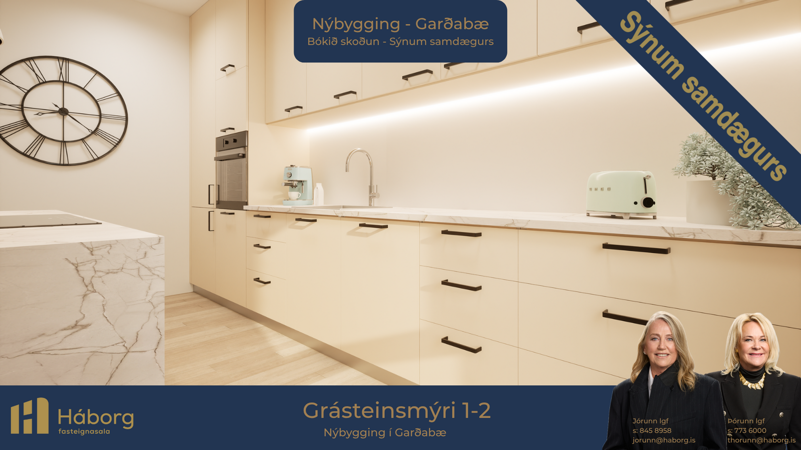 Háborg fasteignasala kynnir Grásteinsmýri 1, Garðabæ. Nýbyggingin er staðsteypt, einangruð að utan og klædd með ál- og bambus klæðningu. Góðar 2ja, 3ja 4ra og 5 herbergja íbúðir í litlu fjölbýli með lyftu. Útsýni er úr flestum íbúðum og timbur-verönd fylgir íbúðum á 1. hæð. Íbúðirnar afhendast án megin gólfefna en baðherbergi eru flísalögð að hluta. Næg bílastæði á lóð. Áætluð afhending íbúða er í mars-apríl 2026.Sölusíða GrásteinsmýriNýr valkostur í fjármögnun. Kaupendur geta nýtt sér nýjan sjóð Öxar 20 sem styður þá með því að fjárfesta með þeim allt að 20% af kaupverði. Kynntu þér málið hér Öxar.isNánari lýsing á íbúð 105 4ra herbergja: Stærð 121,7 fm. Sérinngangur. Þegar komið er í forstofu eru góðir fataskápar. Sér þvotthús innaf forstofu með góðri vinnuaðstöðu. Barnaherbergi er rúmgott og bjart með góðum fataskápum. Hjónaherbergi er einnig rúmgott og bjart með góðum fataskápum. Baðherbergi er með glugga og góðri snyrtiaðstöðu. Einnig er aðstaða fyrir þvottavél og þurrkara á baði. Alrými er mjög rúmgott og bjart með opið eldhús með eyju sem hægt er að sitja við. Stofur eru rúmgóðar og bjartar. Úr alrými og stofu er útgengt á timbur-verönd (suðvestur) 22,5 fm að stærð.Eigninni fylgir stæði í bílakjallara merkt B06 og geymsla að stærð 9,2 fm.Nýjar, bjartar og vandaðar íbúðir með góðri lofthæð, þar sem náttúra, ró og nútímaleg hönnun mætast.Innréttingar í íbúðum: AXIS innréttingar í litnum CashmereGrey. AEG innbyggð heimilistæki, ísskápur, uppþvottavél, helluborð og bakarofn. Baðherbergi eru flísalögð að hluta með 60×60 Patch Beige flísum (Ragno). Grohe blöndunartæki eða sambærileg. Egill Árnason hurðir, lamir og hurðabúnaður.
