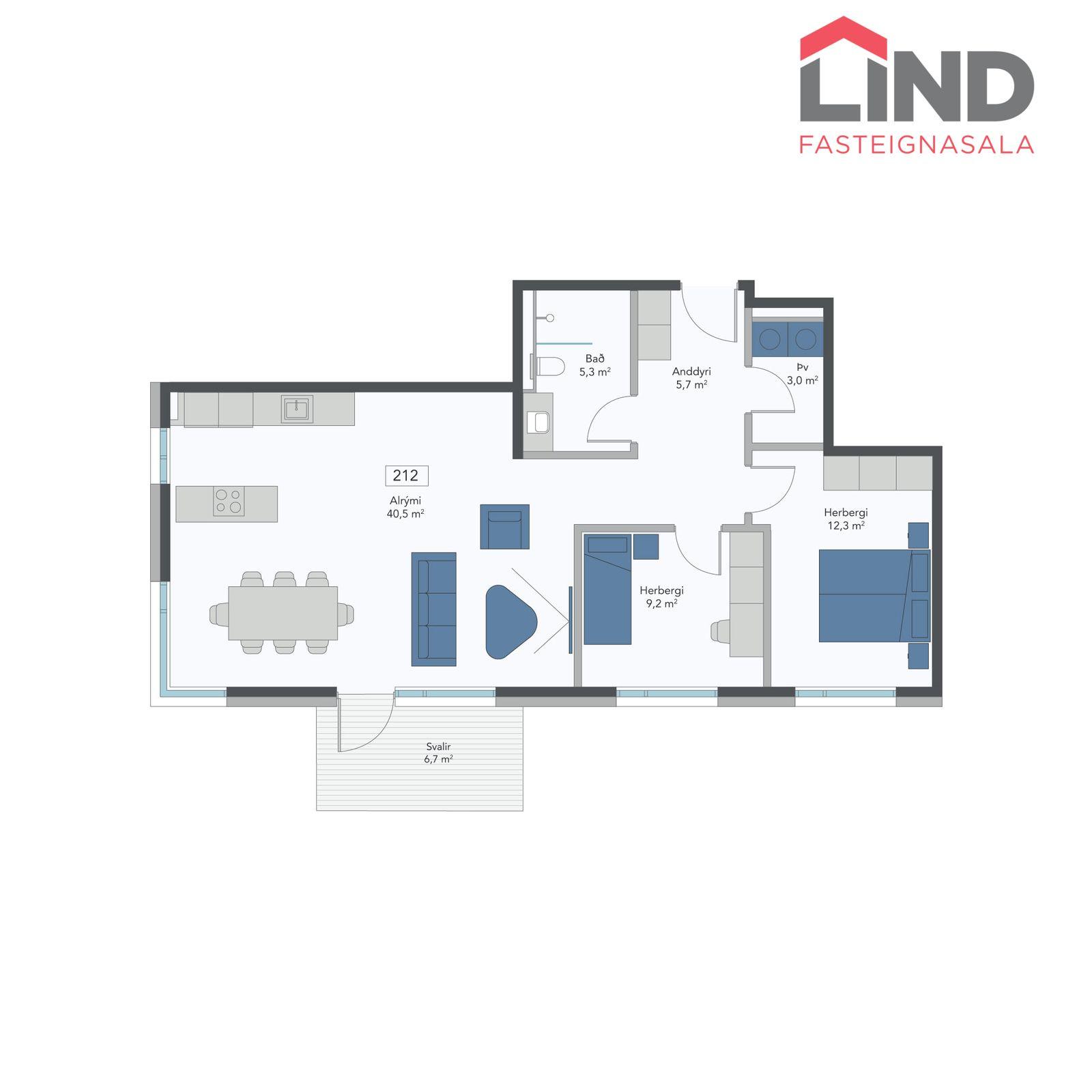 Nánari lýsing: Íbúðin skiptist í forstofu, eldhús í alrými með eyju sem er opið við stofu/borðstofu, 2 svefnherbergi, baðherbergi og þvottaherbergi. Útgengt á svalir frá stofu.