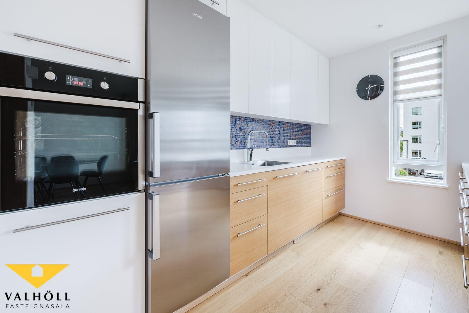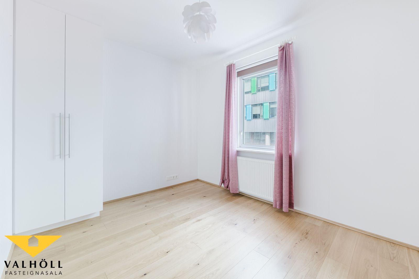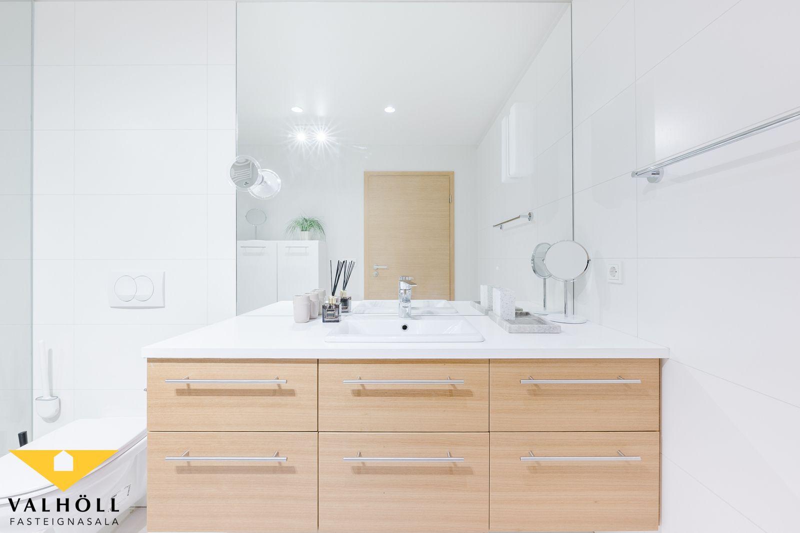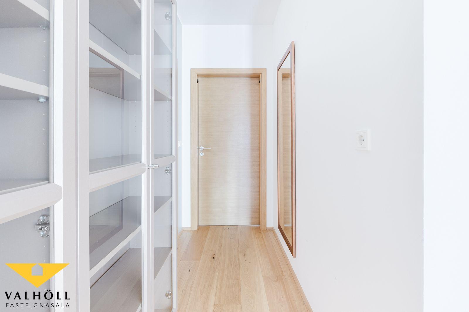 Komið er inn í parketlagt anddyri með rúmgóðum skáð. Rúmgóð stofa með parketi á gólfi og útgengi á yfirbyggðar norður svalir. Eldhús er fallegt og vel með farið, hvítt og eik, eyja með eldavél, úr borðkrók er gengið út á yfirbyggðar rúmgóðar suður svalir. Inn af eldhúsi er þvottahús. Svefnherbergisgangur með tveimur herbergjum og baðherbergi á milli herbergja. Hjónaherbergið er rúmgott með stórum fataskáp og parket á gólfi. Auka herbergi með skáp og parketi á gólfi. Baðherbergið er með flísum á veggjum og gólfi, innréttingu og sturtu.
