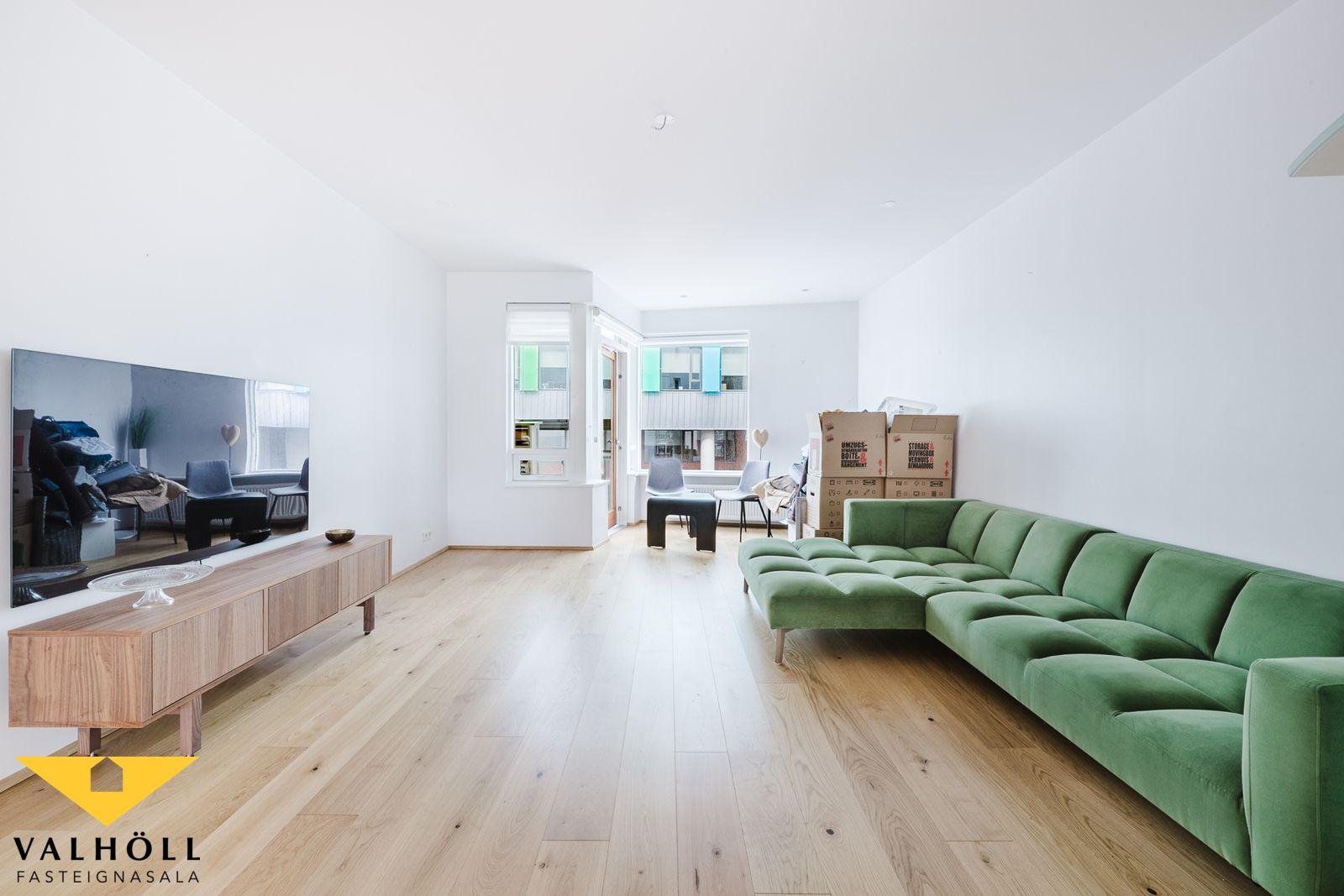 Valhöll fasteignasala og Heiðar Friðjónsson lögg. fast. s.693-3356 kynna til sölu bjarta og vel um gegna 126,1 fm íbúð á 2. hæð í lyftuhúsi við Mánatún 7 í Reykjavík. Íbúðin er með tveimur svefnherbergjum, rúmgóðum stofum, opnu eldhúsi með eyju, tvennum svölum sem eru báðar lokaðar með gleri og stæði í bílageymslu þar sem búið er að leggja fyrir rafhleðslustöð. Aðeins tvær íbúðir á hverri hæð. Í kjallara er sér 8,8 fm geymsla. Garðurinn sem er aflokaður á milli húsa er mjög flottur með bekkjum og leiktækjum. Ath. íbúðin er laus við kaupsamning.
