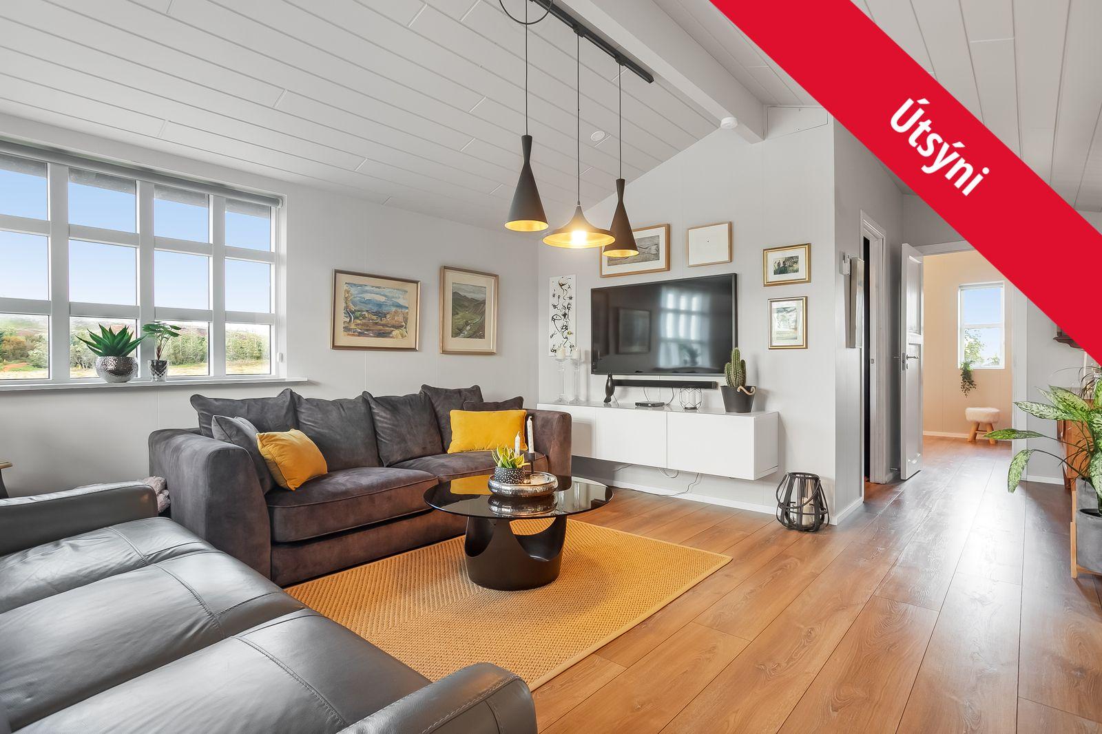 **SÆKTU SÖLUYFIRLIT SJÁLFVIRKT HÉR** **SKOÐAÐU EIGNINA Í ÞRÍVÍÐRI SÝN MEÐ OG ÁN HÚSGAGNA** (ýtir á takkann niðri í vinstra horni þar sem er stóll með / merki yfir)Núverandi skipulag eignar: Gangur, eldhús, stofa, þrjú svefnherbergi, baðherbergi, þvottahús/geymsla, upphitaður geymsluskúr, gróðurhús og kaldur geymsluskúr