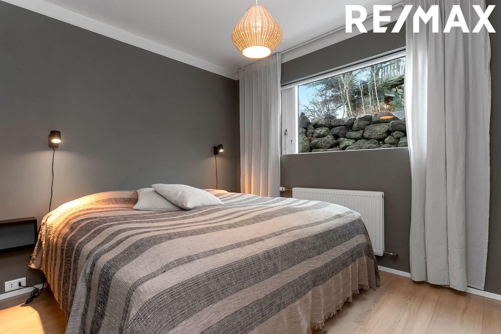 Hjónaherbergið er með harðparketi á gólfi og rúmgóðum skáp.