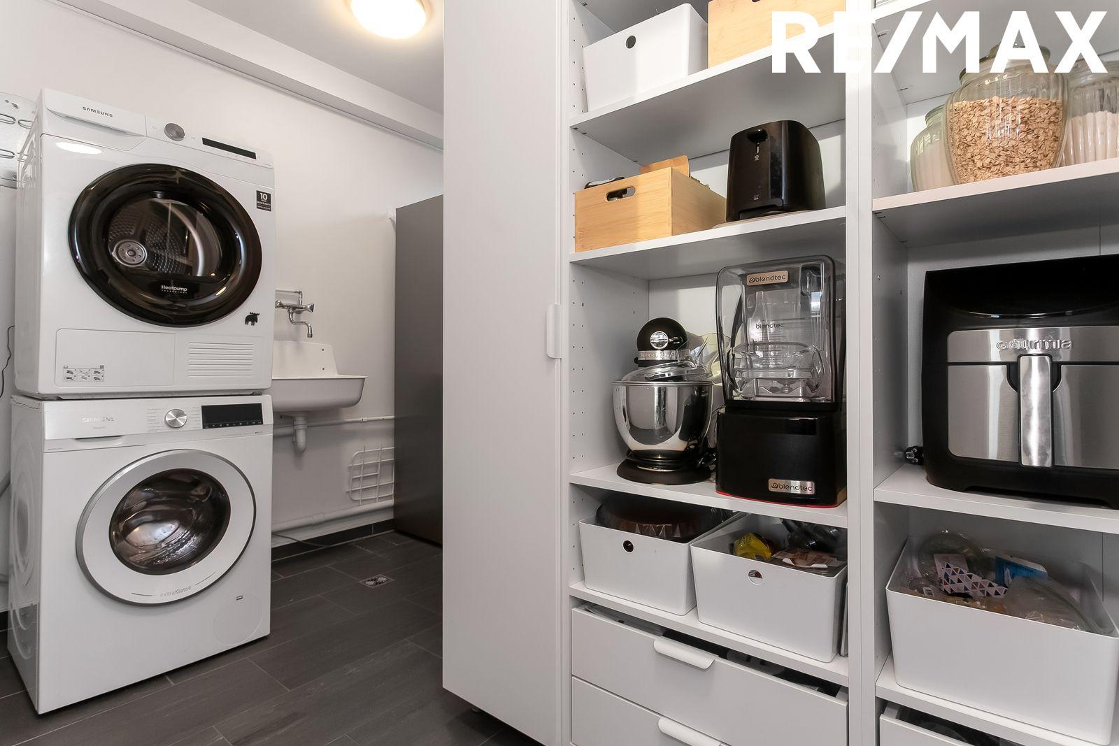 Þvottahús/geymsla er rúmgóð með tengi fyrir þvottavél og þurrkara, skolvask og léttri hvítri innréttingu.
