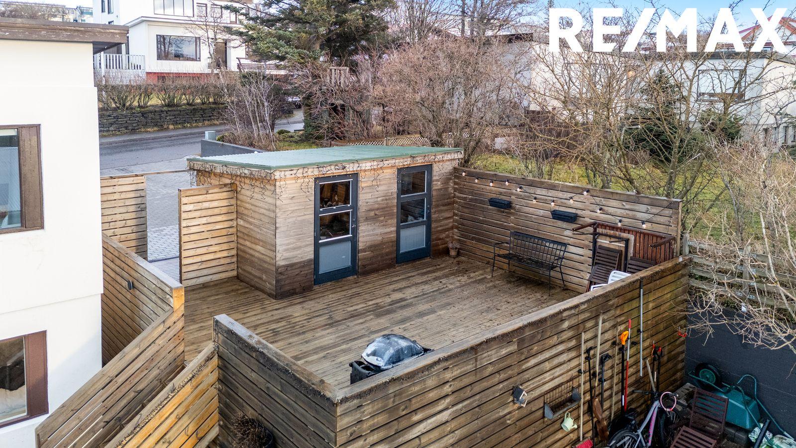 Geymsluskúr er á lóðinni sem er í sameign beggja hæða. Hægt er að skipta upp í tvö 7,5 fm geymslurými. Rafmagn er í skúrnum.