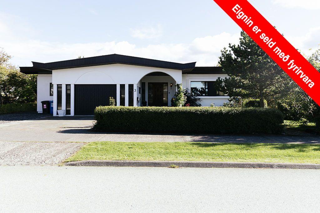 Lýsing eignar: Góð aðkoma, rúmgott hellulagt bílastæði. Flísalögð forstofa með skápum og gestasnyrting. Bjart alrými sem tengir saman íbúðarrýmið. Rúmgóð björt stofa og borðstofa. Eldhús með fallegum innréttingum og borðkróki. Inn af eldhúsi er bjart þvottahús með sér útgangi. Einnig er búr. Stofa, borðstofa og sjónvarsstofa. Útgengt úr stofu út á stórar og sólríkar suðursvalir. Á svefnherbergisgangi er tvö svefnherbergi annað með skápum. Skápar eru á gangi. Stórt fjölskyldu/frístundaherbergi með góðu skápaplássi. Herbergið var áður bílskúr. Baðherbergi flísalagt í hólf og gólf með hita í gólfi. Stór og góð sturta, innrétting með góðu skápaplássi, gluggi á baði. Geymsla er í bílskúr. Húsið hefur fengið hefðbundið viðhald. Falleg, ósnortin hraunlóð sem býður upp á sannkallaðan ævintýraheim. Undir svölunum er gott vinnurými sem býður upp á ýmsa fjölbreytta nýtingarmöguleika. Húsið er teiknað af Kjartani Sveinssyni,