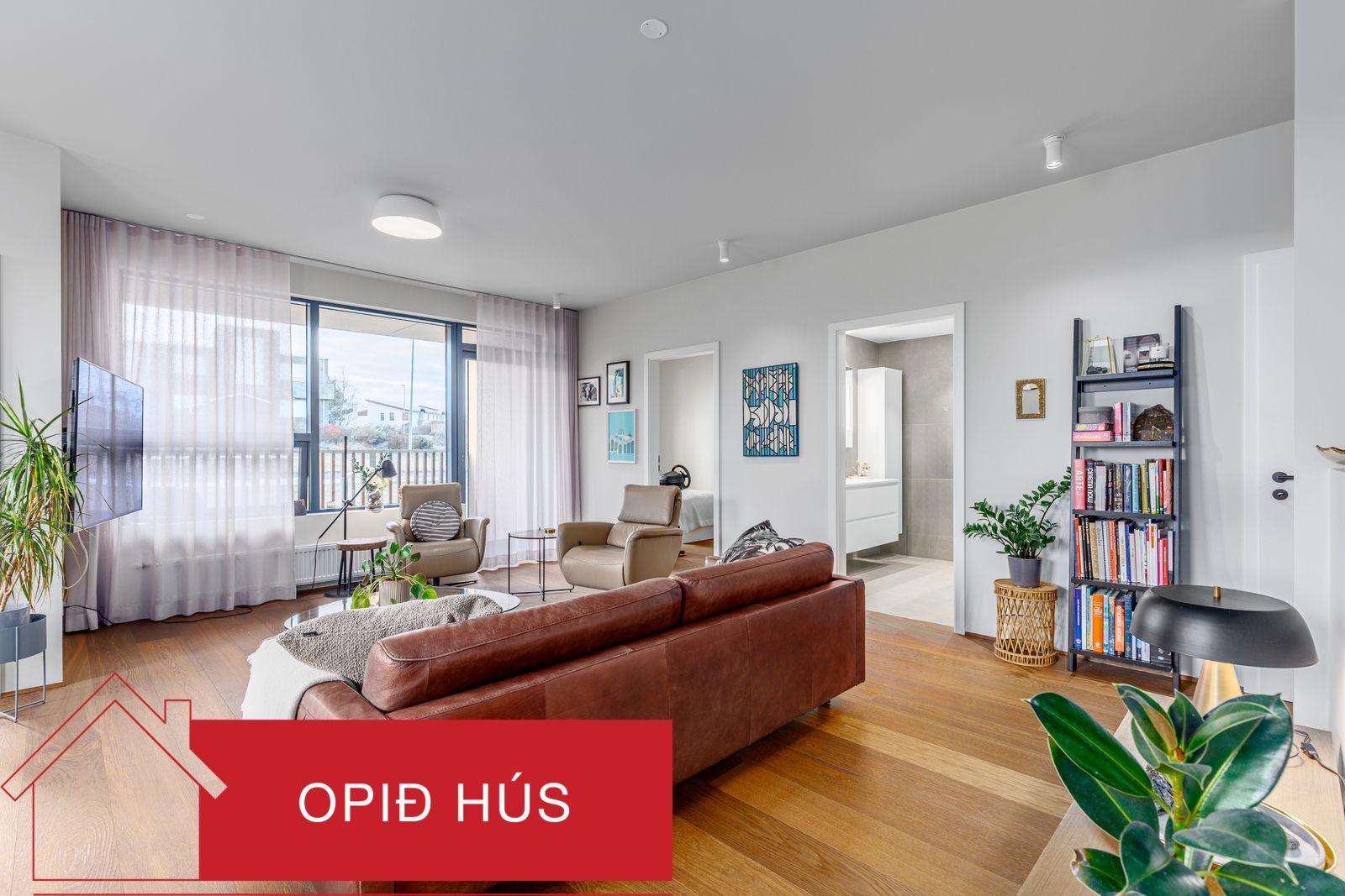 Dagbjartur Willardsson löggiltur fasteignasali og RE/MAX kynna, Eskiás 5F, íbúð 0208 fnr. 252-8335- SÉRINNGANGURÍbúðin er skráð hjá þjóðskrá 113,9 fm og er geymsla innan íbúðar skráð í þann fermetrafjölda. Þrjú svefnherbergi eru í íbúðinni. íbúðin er á efri hæð í tveggja hæða húsi Skráð byggingarár er 2024 en núverandi eigendur tóku við íbúðinni nýrri í ágúst 2024. Íbúðin er einstaklega björt og falleg horníbúð. Sjá má fyrirkomulag íbúðar á gólfteikningu sem er vistuð þar sem ljósmyndir af eigninni eru. FÁÐU SENT SÖLUYIRLIT YFIR EIGNINA HÉR.Nánari lýsing:Aðkoma: Bílastæði við húsið. Gengið er upp í íbúðina í forstofu á jarðhæð og þaðan er teppalagður stigi að íbúðinni á 2. hæð.