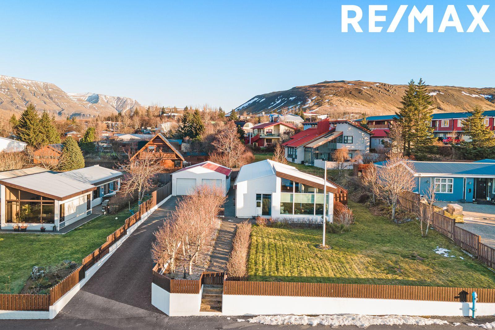 Bílskúr: Er tvöfaldur og rúmgóður 52,9 m² með hita og rafmagni og nýlegu bílskúrshurðum. Hellulögð heimreið og gott bílaplan fyrir framan hús og bílastæði fyri nokkra bíla. Snjóbræðsla í bílaplani en, er orðin léleg svk. seljendum.