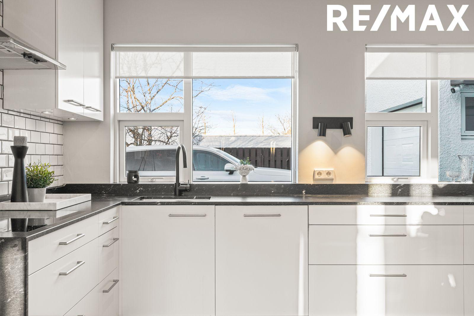 Eldhús: Bjart og opið rými með vandaðri Brúnás innréttingu (2012) og nýlegri borðplötu úr fallegum dökkum stein. Mjög gott vinnu- & skápapláss. Flísar á gólfi.