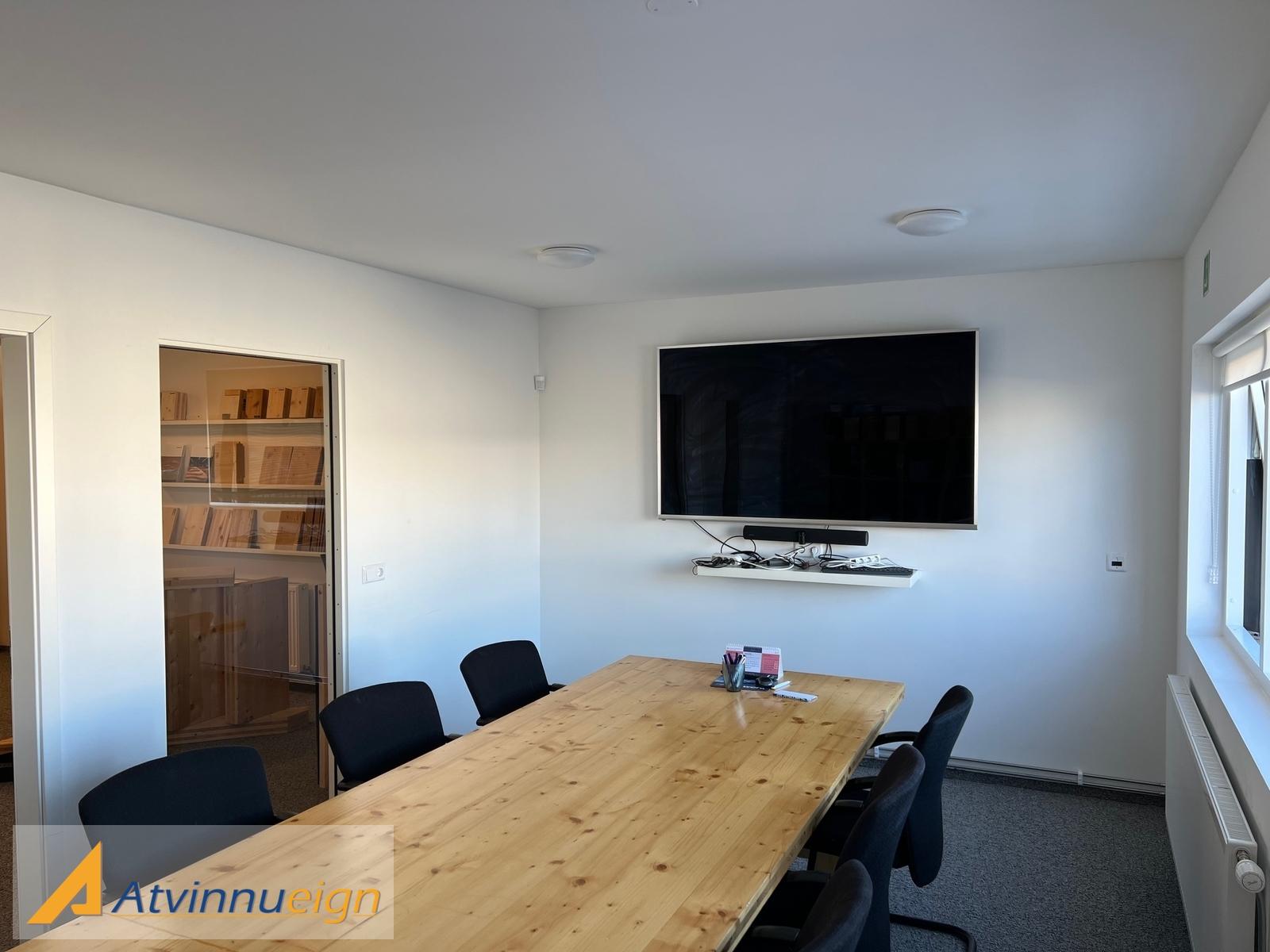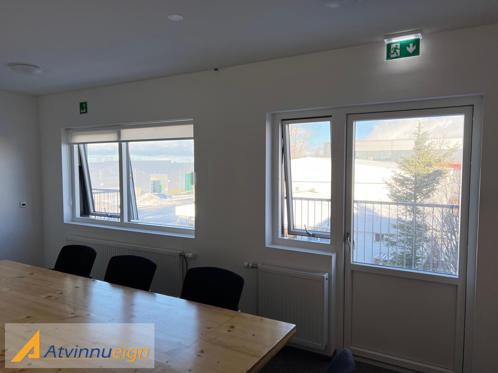 Efri hæðin er; 111,5 fm. Góður stigagangur er á milli hæða sem aðskilur rýmin/hæðirnar. Efri hæðin er innréttuð eins og teikningar gera ráð fyrir, tvö herbergi/rými eru í norður enda, annað hugsað sem kaffistofa. Þá er innréttað baðherbergi, flísalagt með handlaug og salerni og sturtu. Þvottaaðstað/geymsla. Restin af efri hæðinni er í einu, opnu alrými en auðvelt er að skipta því frekar upp með léttum veggjum. Efri hæðin er björt með góðum gluggum á tvo vegu og gefur möguleika á ýmiskonar nýtingu svo sem sem skrifstofur eða önnur sameiginleg rými.