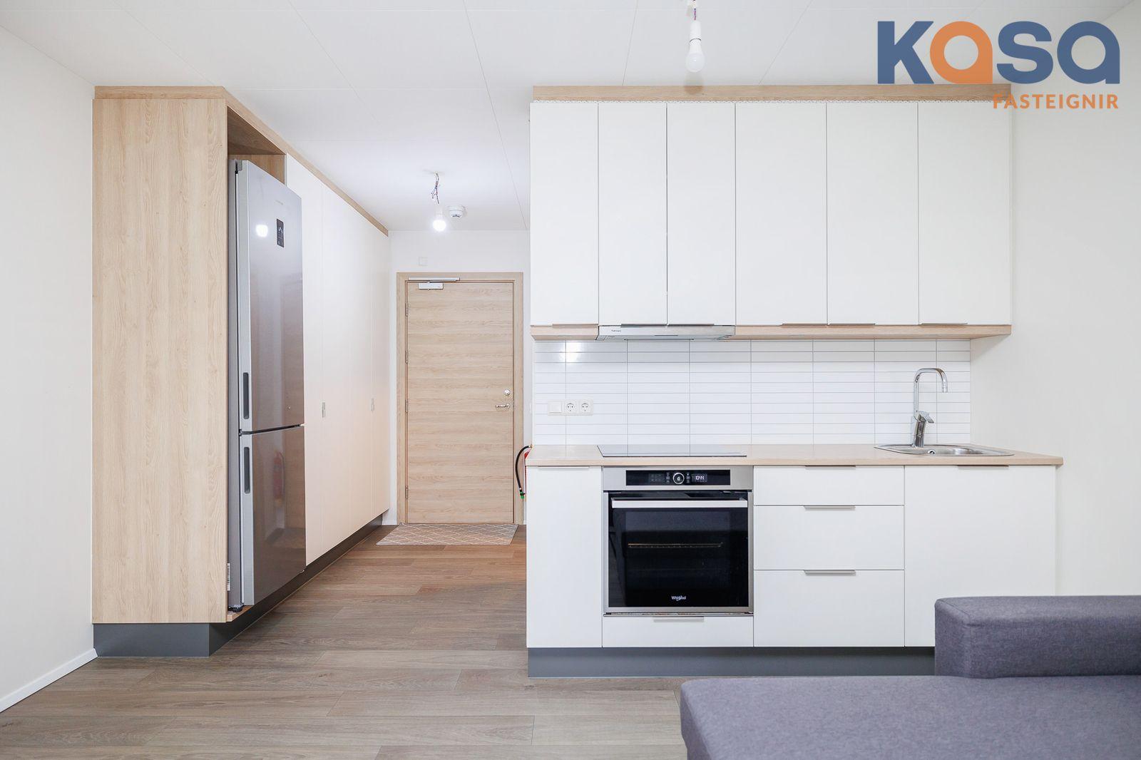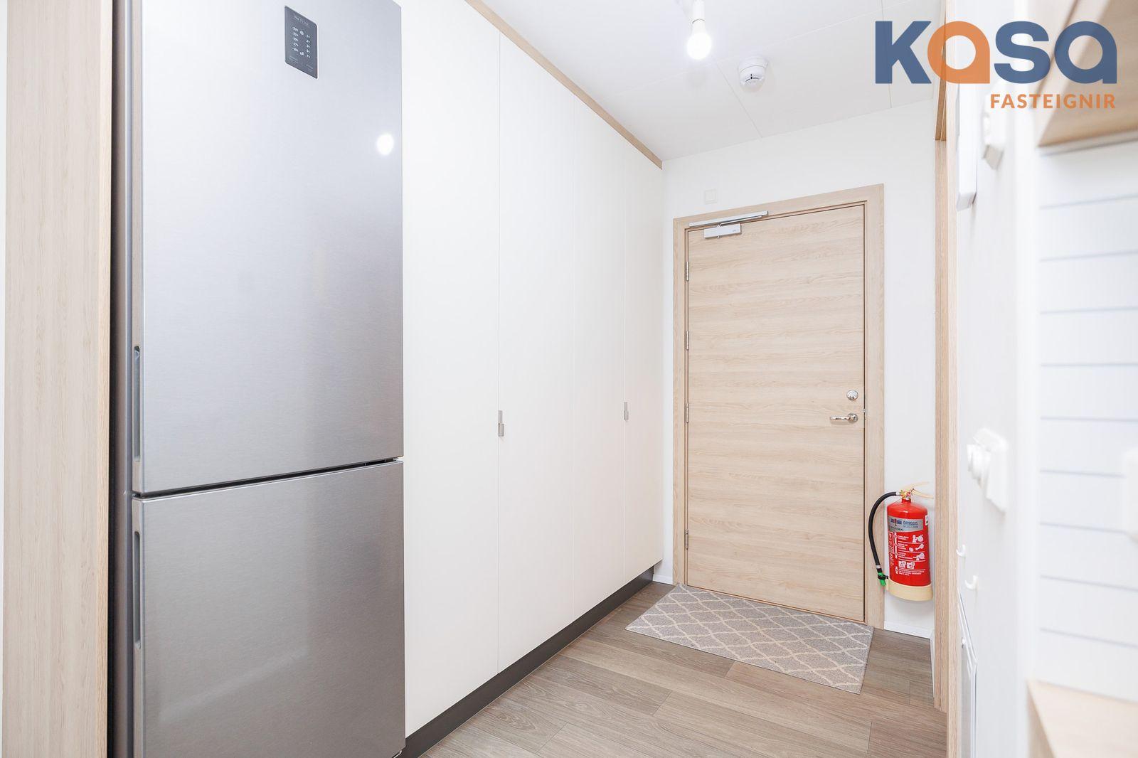 Anddyri er með góðum skápum og við hlið þeirra innst við alrými er stæði fyrir ísskáp. Baðherbergi með vínilparket gólfi og flísar í á gólfi og vegg í sturtu, góð innrétting við og pláss fyrir þvottavél og þurrkara, upphengt salerni og sturta með vængjahurðum. Eldhús og stofa eru í sameiginlegu rými með flísum milli efri og neðri skápa, útgengi úr rýminu um rennihurð út á rúmgóðar svalir til suðurs. Vínilparket er á íbúð, hljóðdempandi plötur í loftum og loftskiptikerfi. Svalir eru rúmgóðar og er kominn svalalokun.