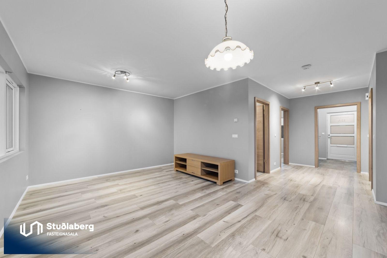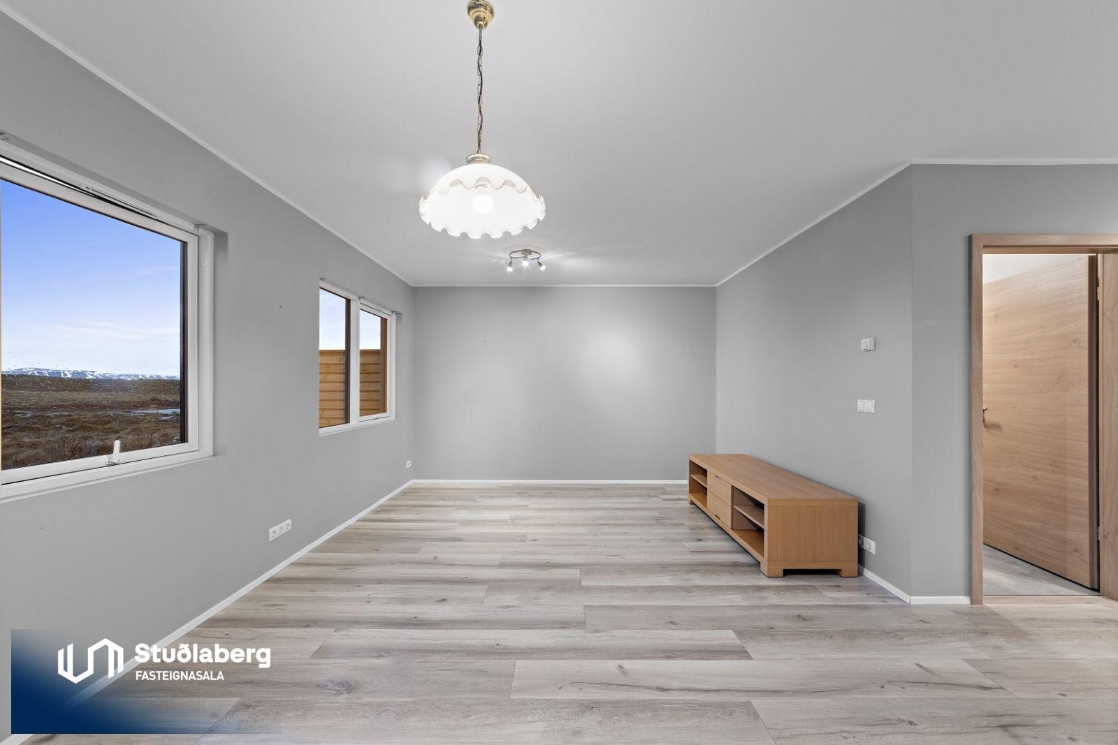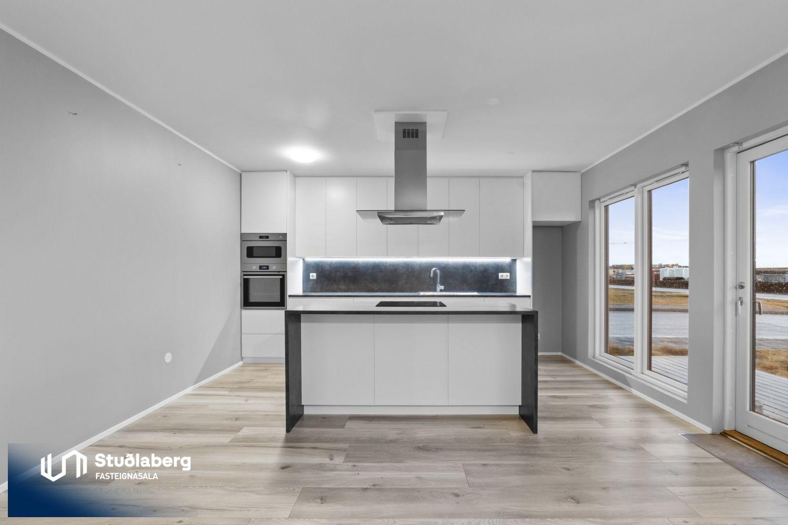 Forstofa hefur flísar á gólfi og góðan forstofuskáp. Eldhús er opið og bjart með parket á gólfi og fallegri hvítri eldhúsinnréttingu og eyju. Bakarofn, vaskur, helluborð og háfur. Stofa er björt og opin við eldhús. Útgent á sólpall. Baðherbergi er flísalagt í hólf og gólf, góða hvíta baðinnrétingu, walk in sturtum og aðstöðu fyrir þvottavél og þurrkara. Svefnherbergin eru tvö, hafa bæði parket á gólfi og fataskápa. Geymsla er innan eignar.