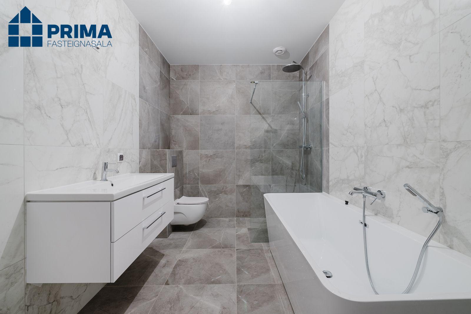 Flísar á baðherbergjum og geymslu eru 60x60 flísar.