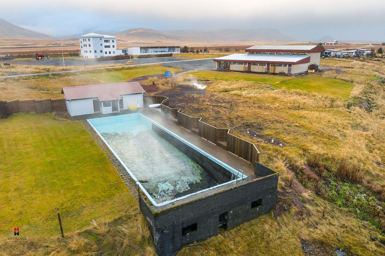 Um er að ræða ágæta sundlaug, skráð 314 m3 byggð upphaflega 1945, ásamt 77,3 fm. búningsaðstöðu- og aðstöðuhúss sem byggt var árið 2002. Sundlaugin hefur verið í ágætu viðhaldi, er lögð nútíma efnum og nýleg verönd (nokkurra ára) hefur verið byggð í kringum hana, með heitum potti.