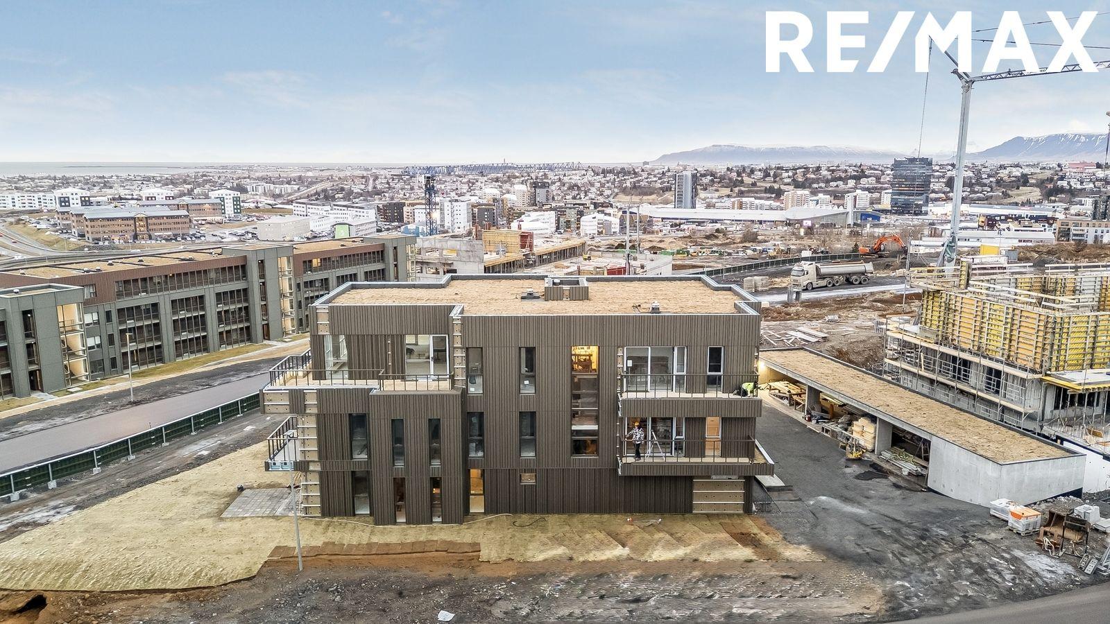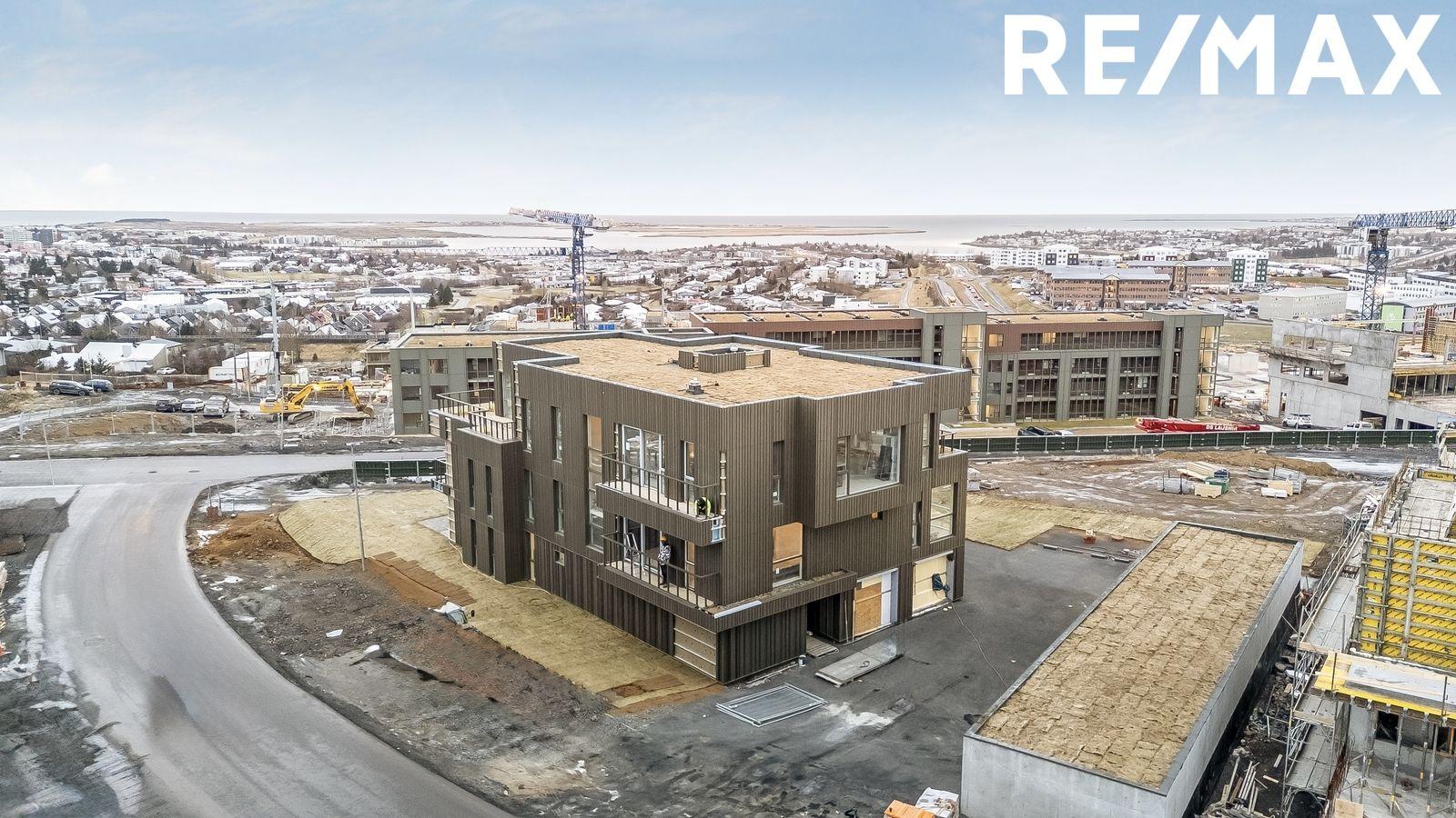 Húsið:Arkitektar og aðalhönnuðir hússins eru Sen&Son arkitektar ehf. Húsið er steinsteypt þriggja hæða fjölbýlishús með 7 íbúðum í einum stigagangi með lyftu. Á 1. hæð er anddyri, geymslur íbúða, tæknirými og tveir innbyggðir bílskúrar. Á 1. hæð eru einnig tvær glæsilegar íbúðir með beinu aðgengi út í garð. Á 2. hæð hússins eru þrjár virkilega flottar íbúðir og á 3. hæð hússins eru svo tvær stórglæsilegar íbúðir, en með þeim fylgja bílskúrarnir. Á lóðinni er bílageymsla með 7 bílastæðum. Bílageymslan er opin að hluta með lokuðum hliðum og upphituðu gólfi. Gert er ráð fyrir lagnaleið að hverju stæði fyrir möguleika á rafhleðslustöð.