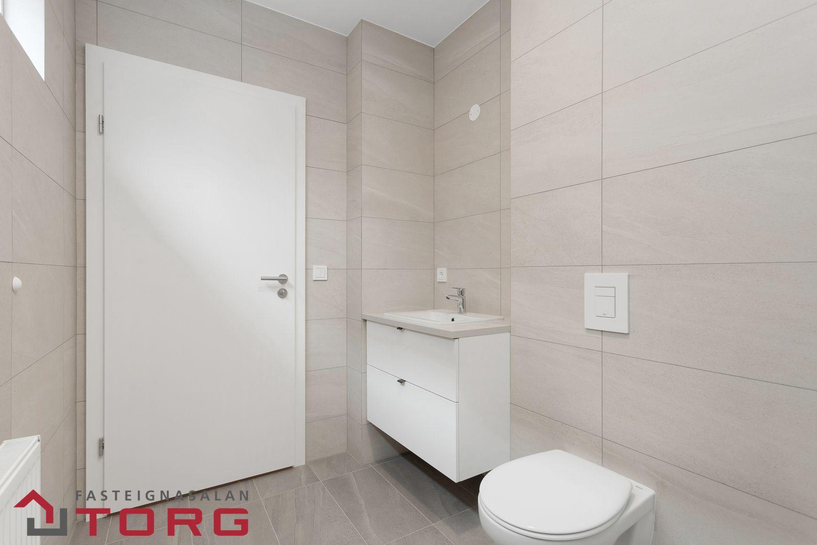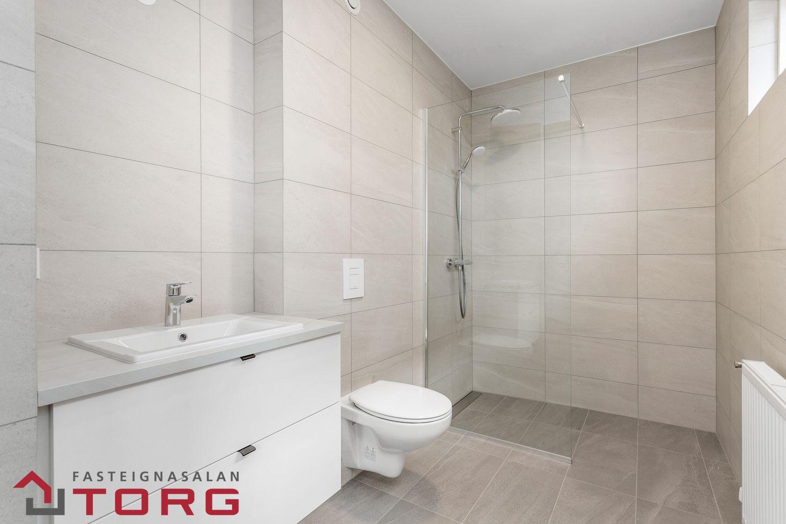 Alrými með stofu og eldhúsi, innréttingar í eldhúsi eru frá HTH innréttingum eða sambærilegum, hvítar og ljós-ask litaðar. Spanhelluborð, gufugleypir/eyjuháfur, ísskápur og innbyggð uppþvottavél frá AEG eða sambærilegu. Vönduð blöndunartæki.